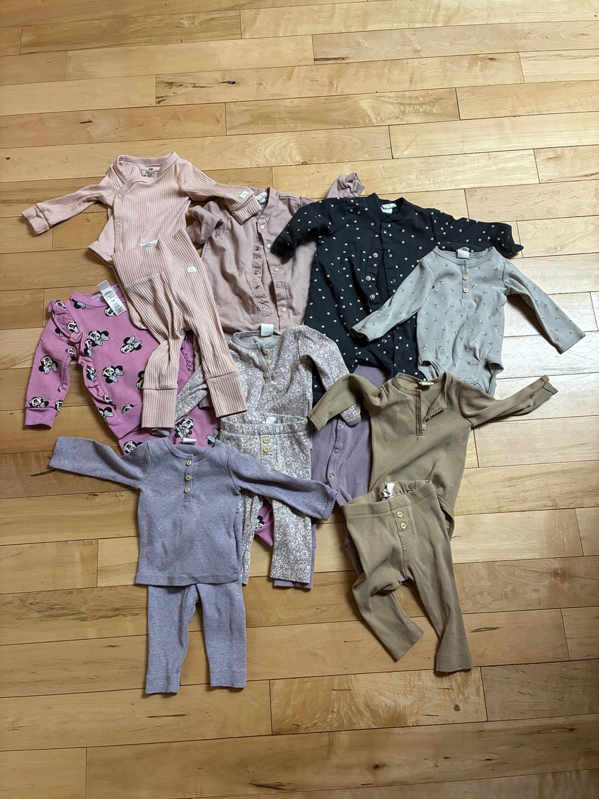 The H&M Baby Clothes set includes a variety of adorable Disney-themed sleepers, outfits, pants, and sweaters for baby girls aged 0-3 months. The multicolor designs add a fun and playful touch to the assortment, making dressing time both enjoyable and convenient. With the trusted H&M brand, you can be sure that these baby clothes are both stylish and comfortable for your little one to wear during naptime or playtime. The lot includes 9 different outfits 8 of which are HM 0-3 Months and 1 is Disney baby 12 Months. The outfit are in great condition a couple of them do you have some minor stains.