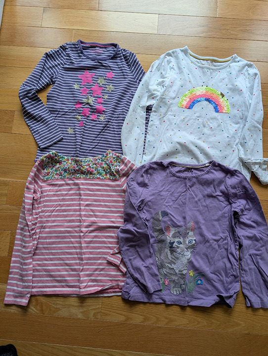 4 girls shirts from mini boden. 3 are size 8-9 and one is size 9-10 but runs the same as the others (purple striped with stars). These are in good used condition with wash wear. Worn regularly to school so might have a few small marks (I don't see any), but no rips.