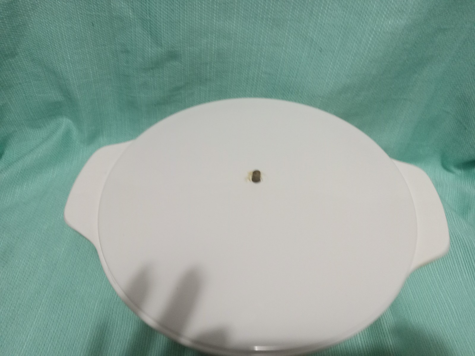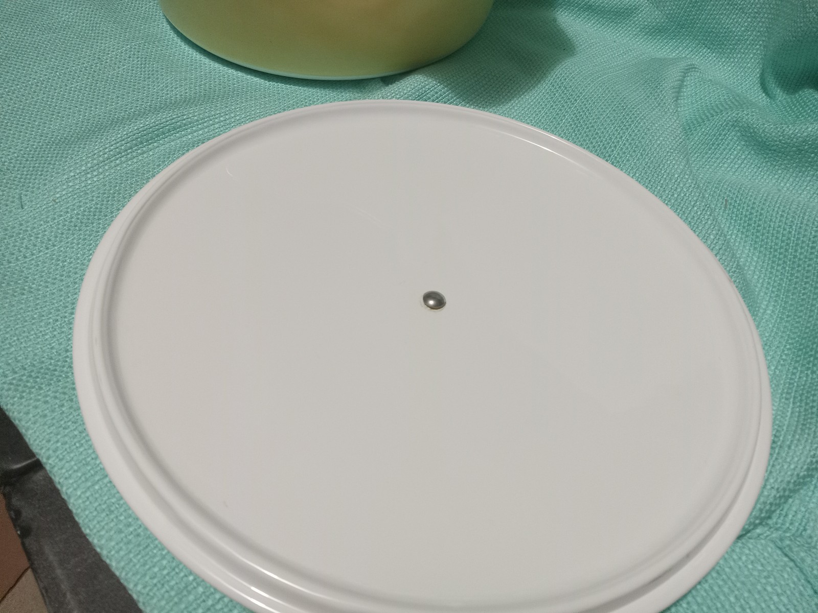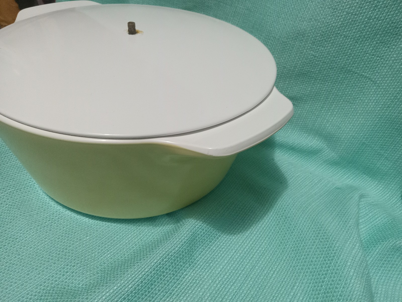 Have a yellow and white vintage 4qt corningware pot with original lid. Lid is missing knob. No breaks or chips paint finish still in good condition. Model b-4-13. 12.5 wide handle to handle 4.5 tall. Smoke free home.