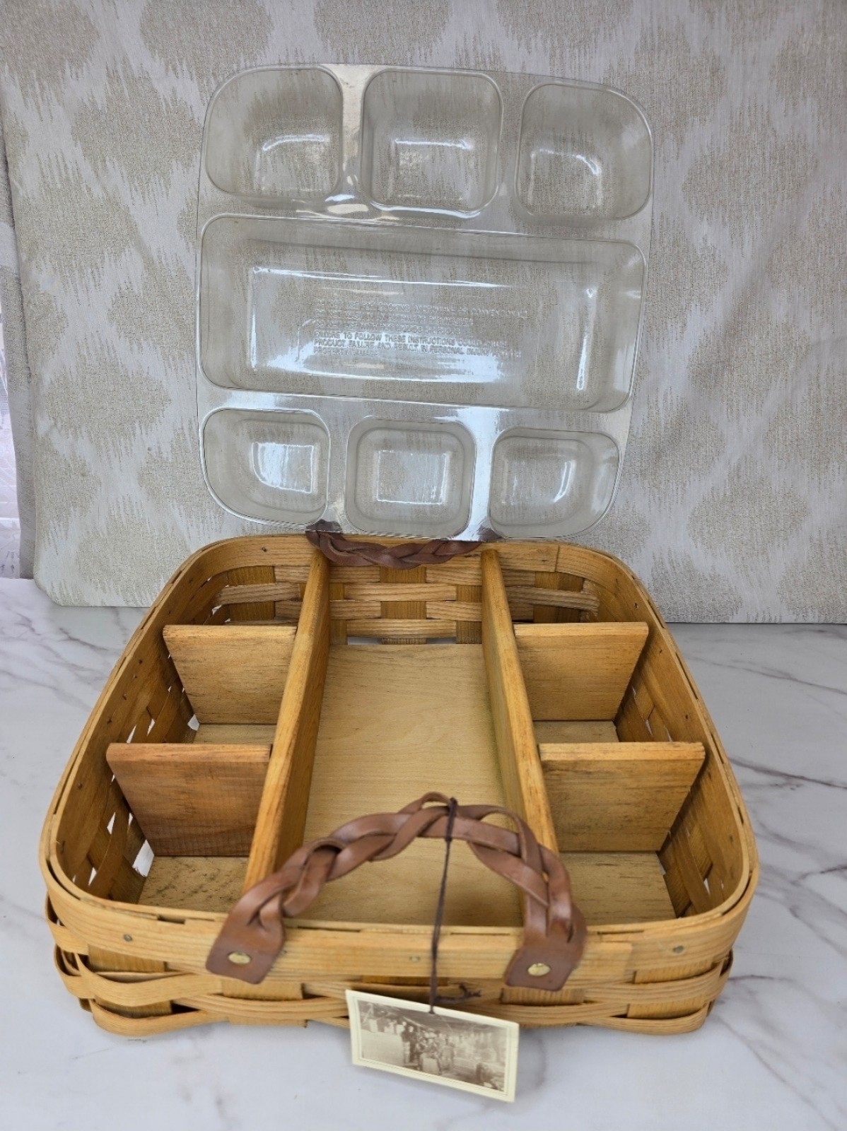 Gorgeous and functional vintage Peterboro utensil/picnic/BBQ basket with plastic liner and dividers for all of your needs. Can be used for napkins and cutlery, sewing items, crafts, and more. Beautiful and sturdy leather braided handles, superior craftsmanship and Iconic Peterboro medalion show this basket's high quality.