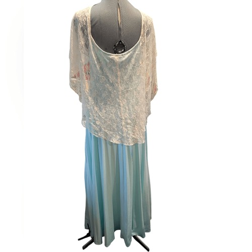 This blouson dress with a lace overlay is a classic style of the 70s. It is full/ankle length with short angel sleeves and is a lovely baby blue colour
