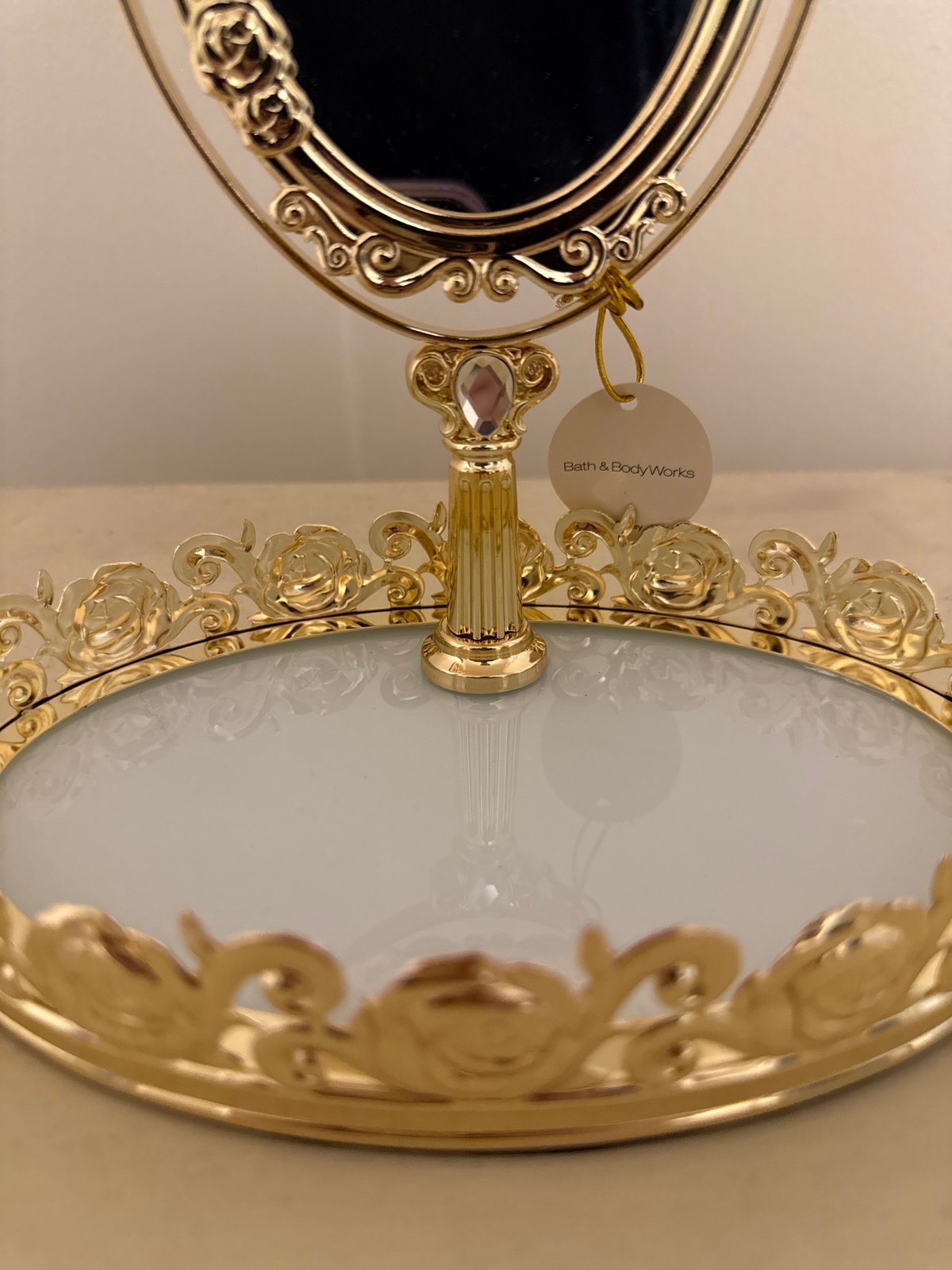 Features beautiful rose floral detailing around “marble” tray with a gem stone at the neck of the mirror. The mirror is double sided and flips around. These are going to be hard to find as they have sold out in stores a while ago. Will be packaged with extreme care. My customers are always satisfied with packaging.