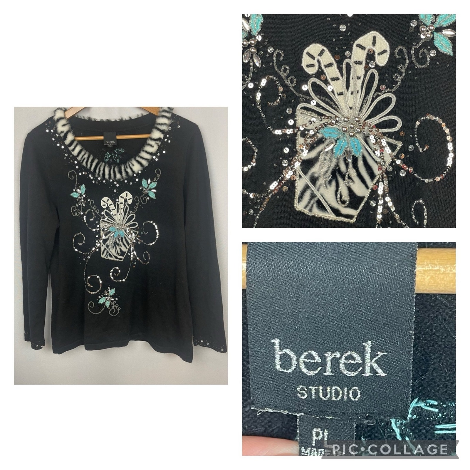 Sweater has embellished details on the sleeve as well as the front.