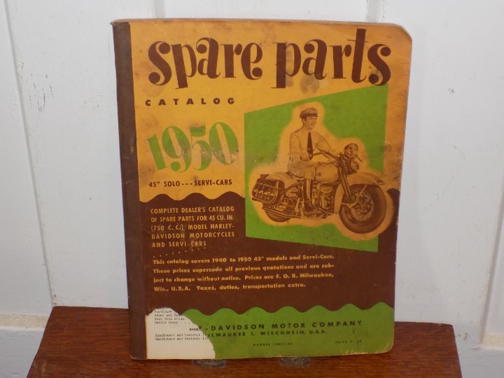 You are buying a Vintage 1950 Harley Davidson Spare Parts Catalog. It measures approx.. 11 x 8.5 inches. Has wear, missing cover corner, grease prints throughout and general wear from age and use. Fresh from an upstate NY estate. Buying as is. Free shipping within the US. 5.22