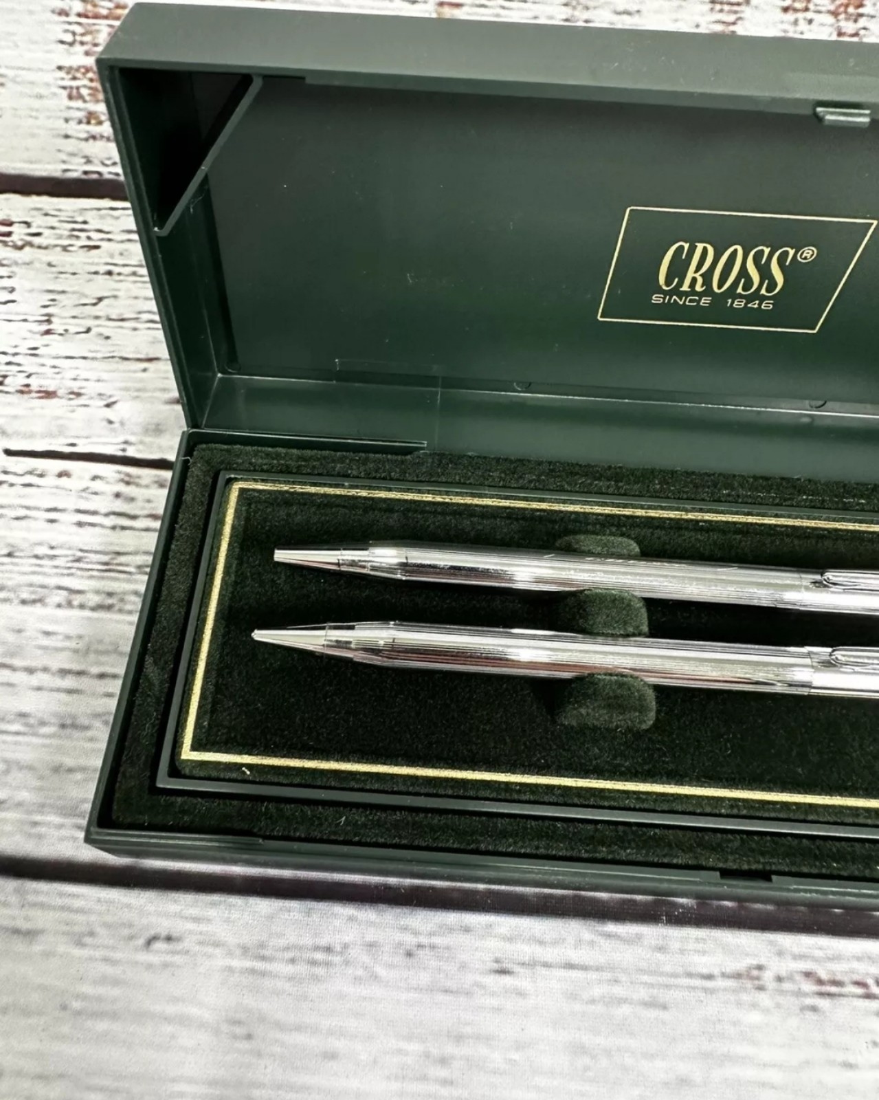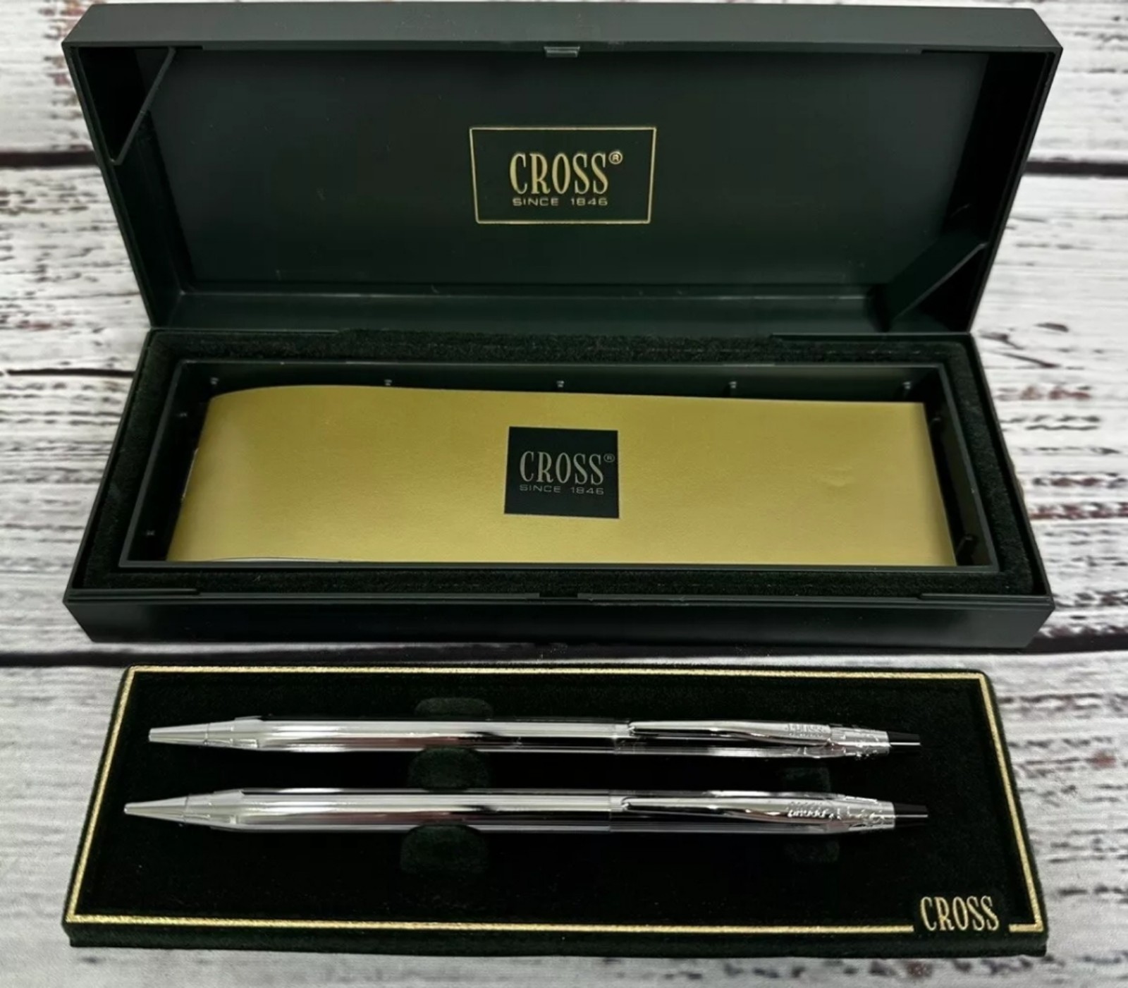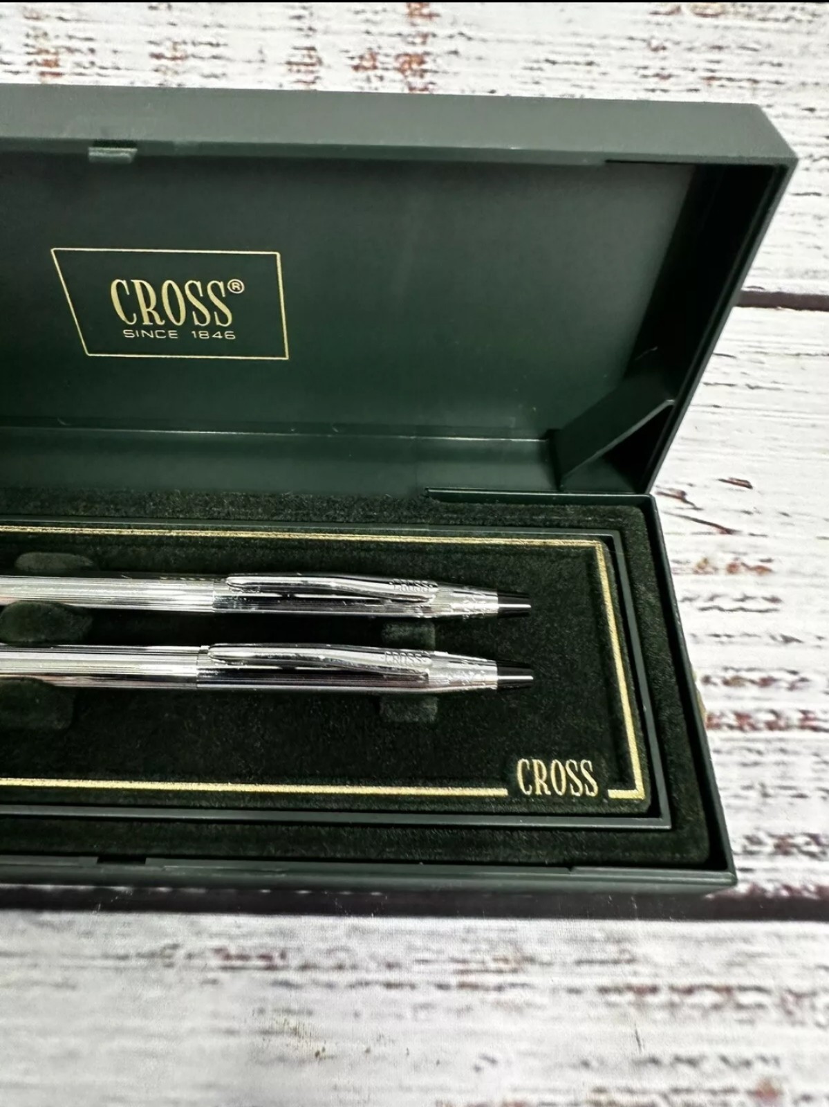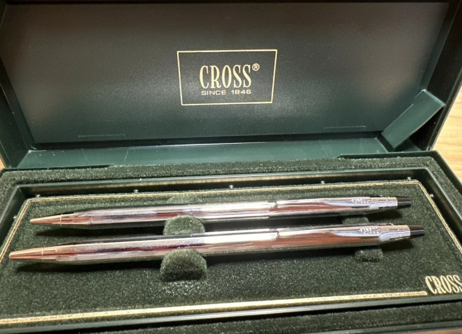Cross Chrome Pen and Pencil Set in its original box. Cross is a well-known brand for quality writing instruments. Here's some information about the set: