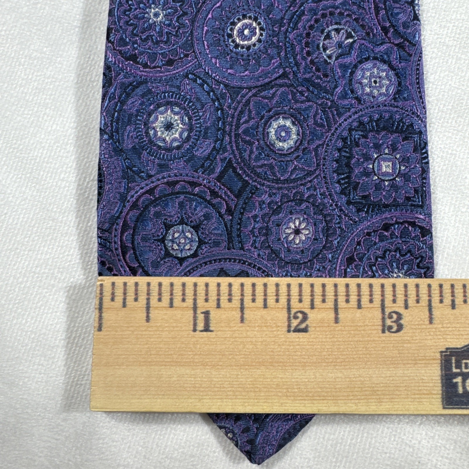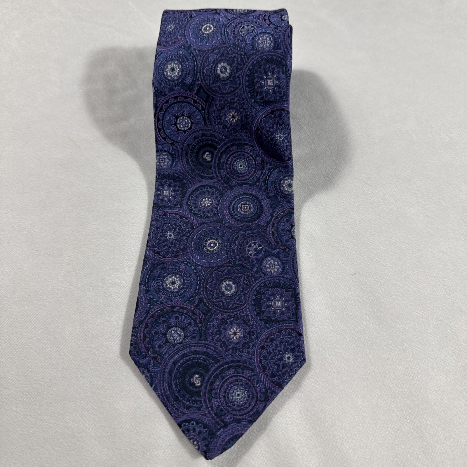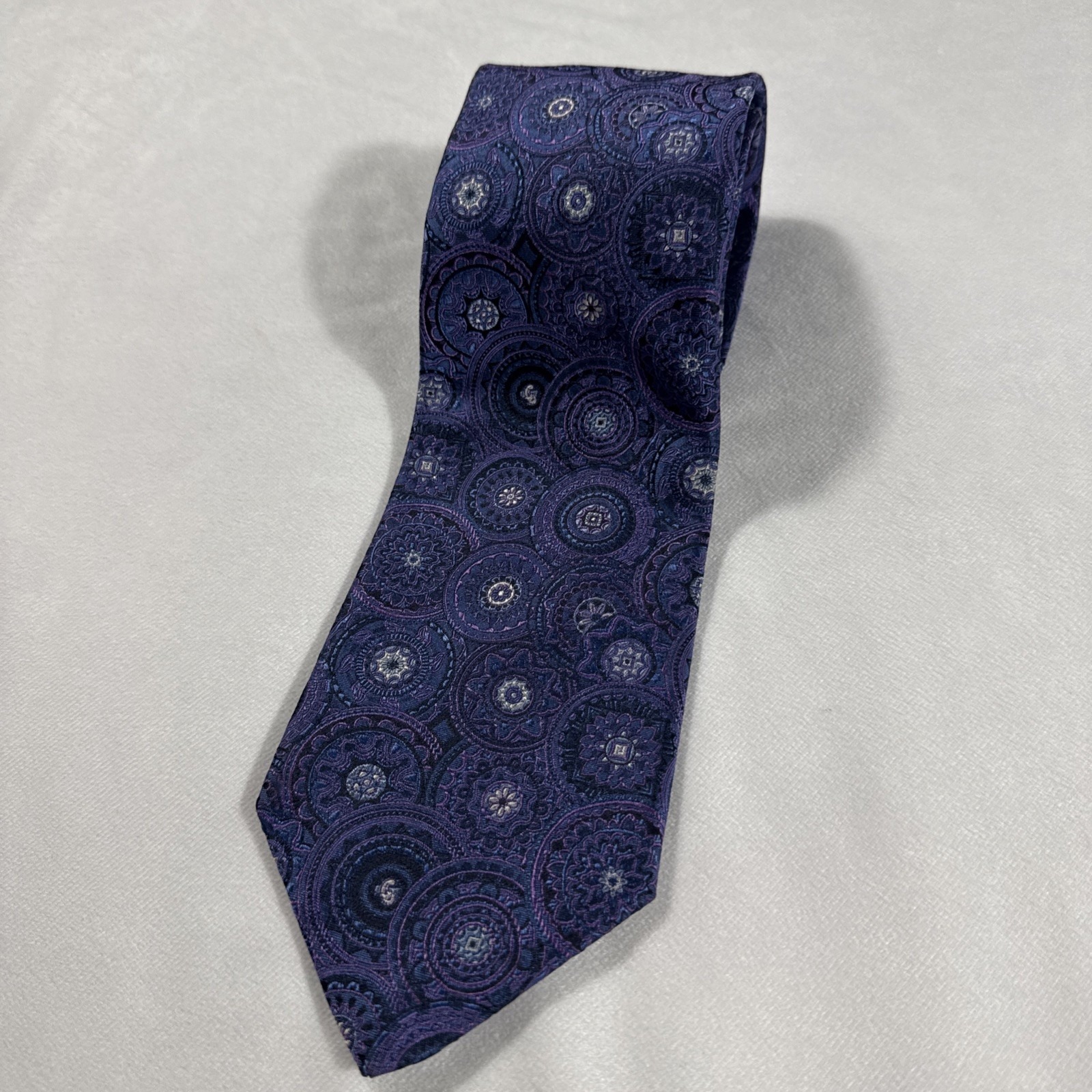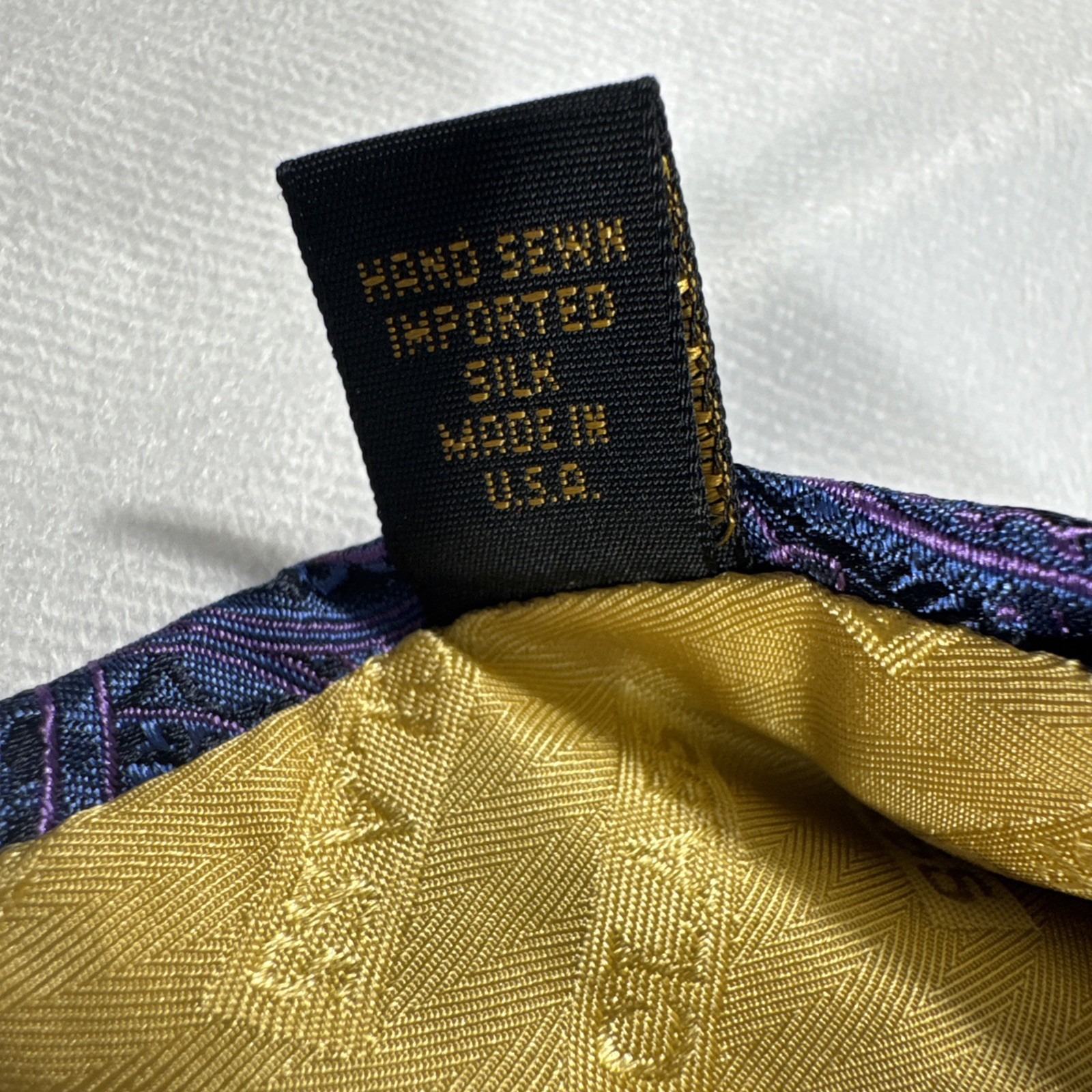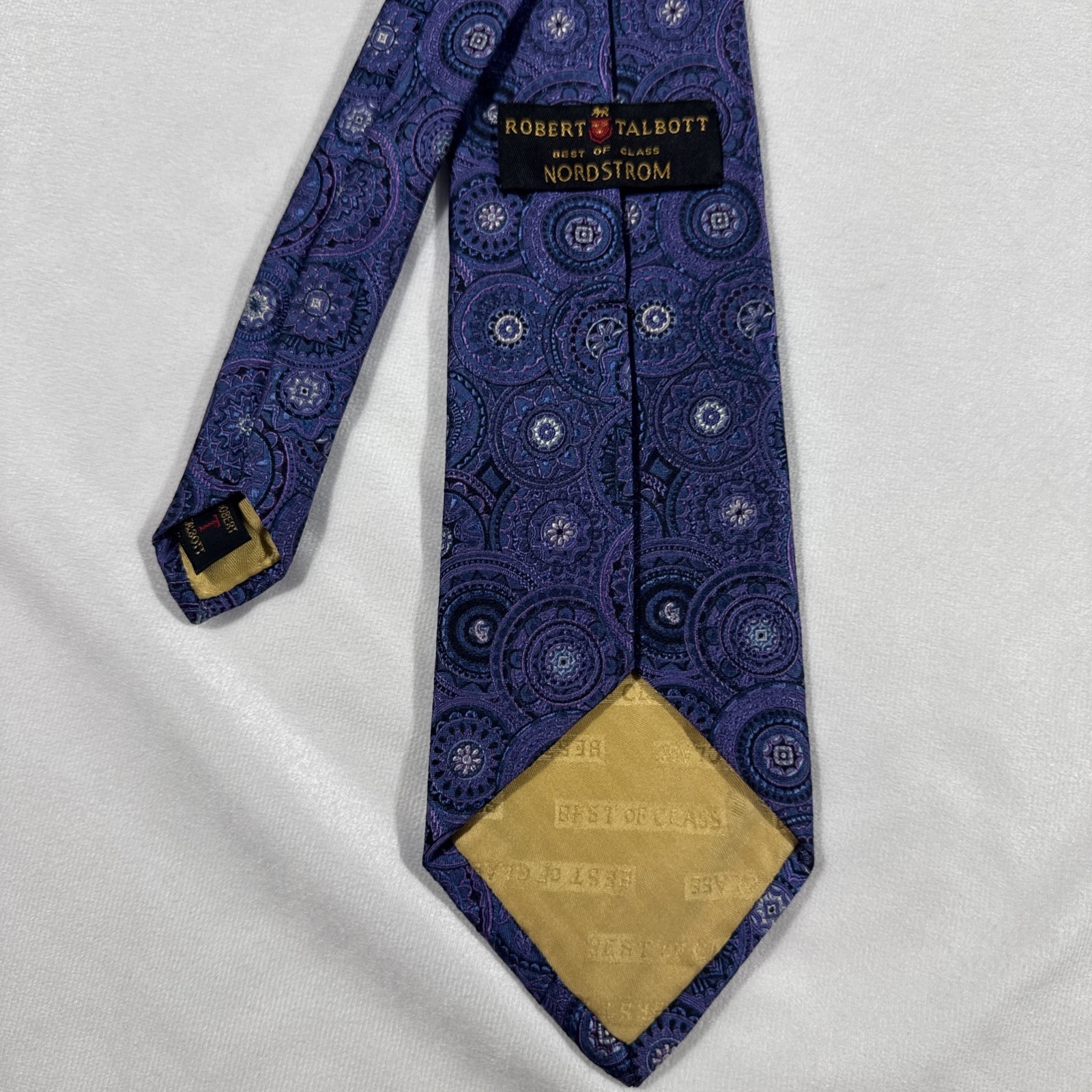 This vintage Robert Talbott Best of Class silk necktie is a designer piece made in the USA. The geometric blue pattern, woven from 100% silk, showcases the brand's attention to detail and quality. This wide, classic-length tie is handmade and features adjustable dimensions, making it a versatile and stylish accessory for men's formal attire.