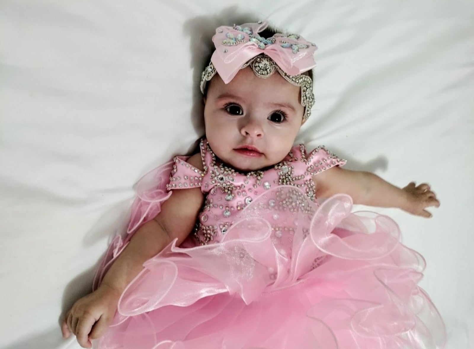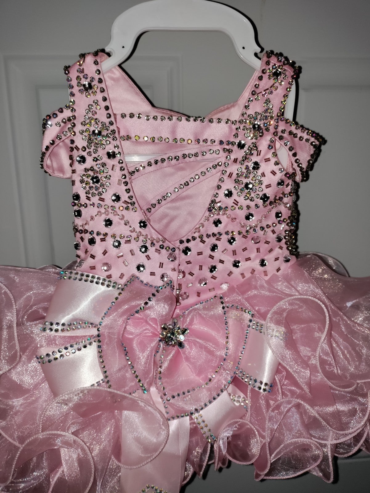 ✨✨ This is a one of a kind custom gem. My lady in California did the special order for me this is all hand stitched and hand embellished. It took her 4 weeks to make this dress. I only used it for photos, therefore it was only used one time for 30 minutes to get these stunning pictures of my daughter turning 6 months like a true Queen ! I figured someone would want to use this for an actual pageant competition hahahaha I can guarantee your daughter would win ! ✨✨✨✨