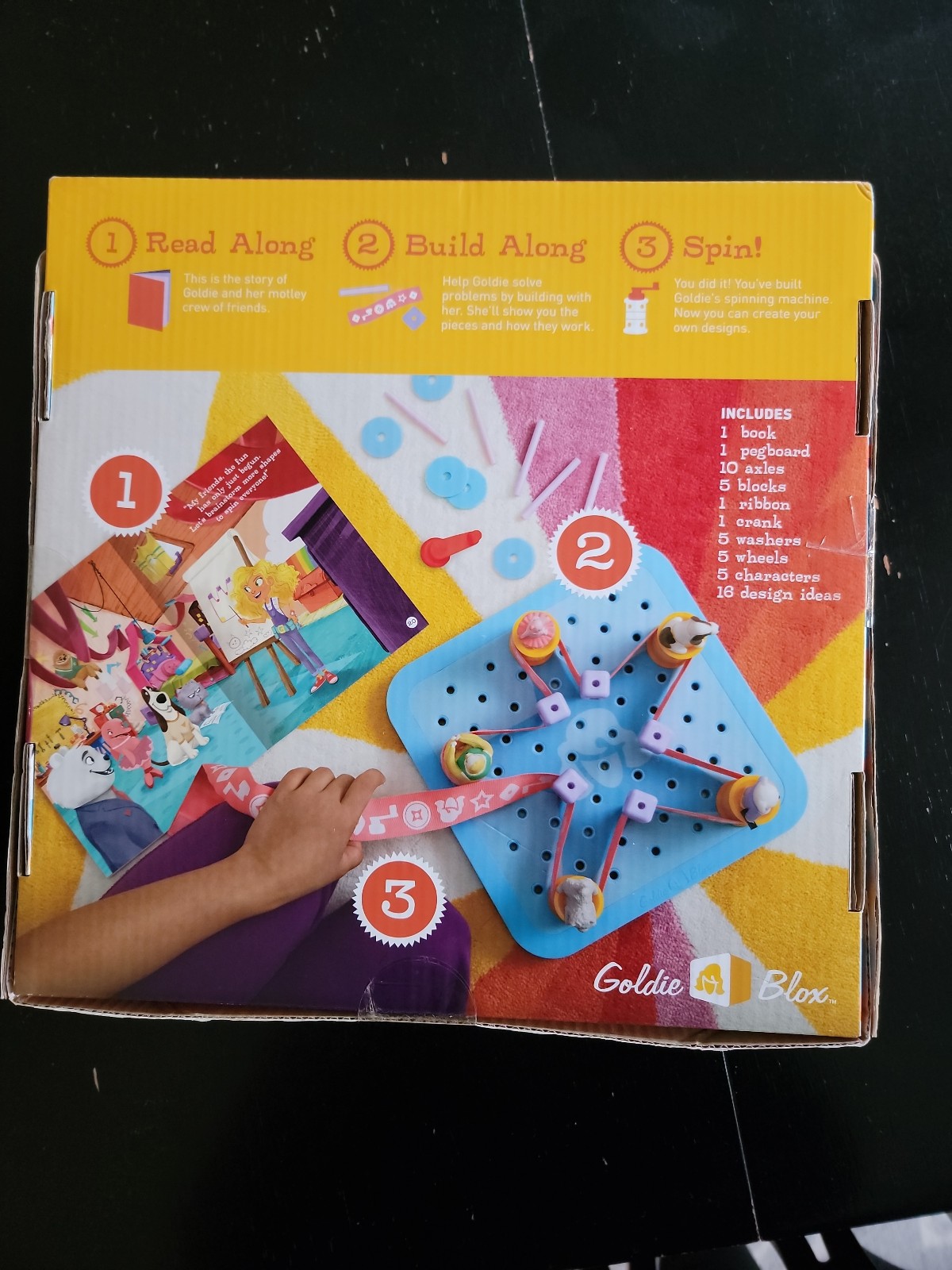 GoldieBlox: Construction toy + storybook set featuring the world's first girl engineer character, Goldie Blox! In this kit, Goldie builds a spinning machine to help her dog, Nacho, chase his tail. Soon all her friends want in on the action. Help Goldie build a belt drive machine to spin everybody at once! Introduces the real-life STEM concept of a belt drive. Winner of: Educational Toy of the Year, People's Choice Toy of the Year, Oppenheim Toy Portfolio Best Toy – Platinum, Parent’s Choice – Gold. Ages 4+. Comes with 34 pieces, including 49-page storybook, 9 additional build ideas, and 5 animal figurines. Hundreds of how-to building videos online to help spark creativity in young engineers. Designed for tinkering and creative exploration, GoldieBlox toys build spatial skills and confidence in problem-solving. All GoldieBlox toys are intercompatible