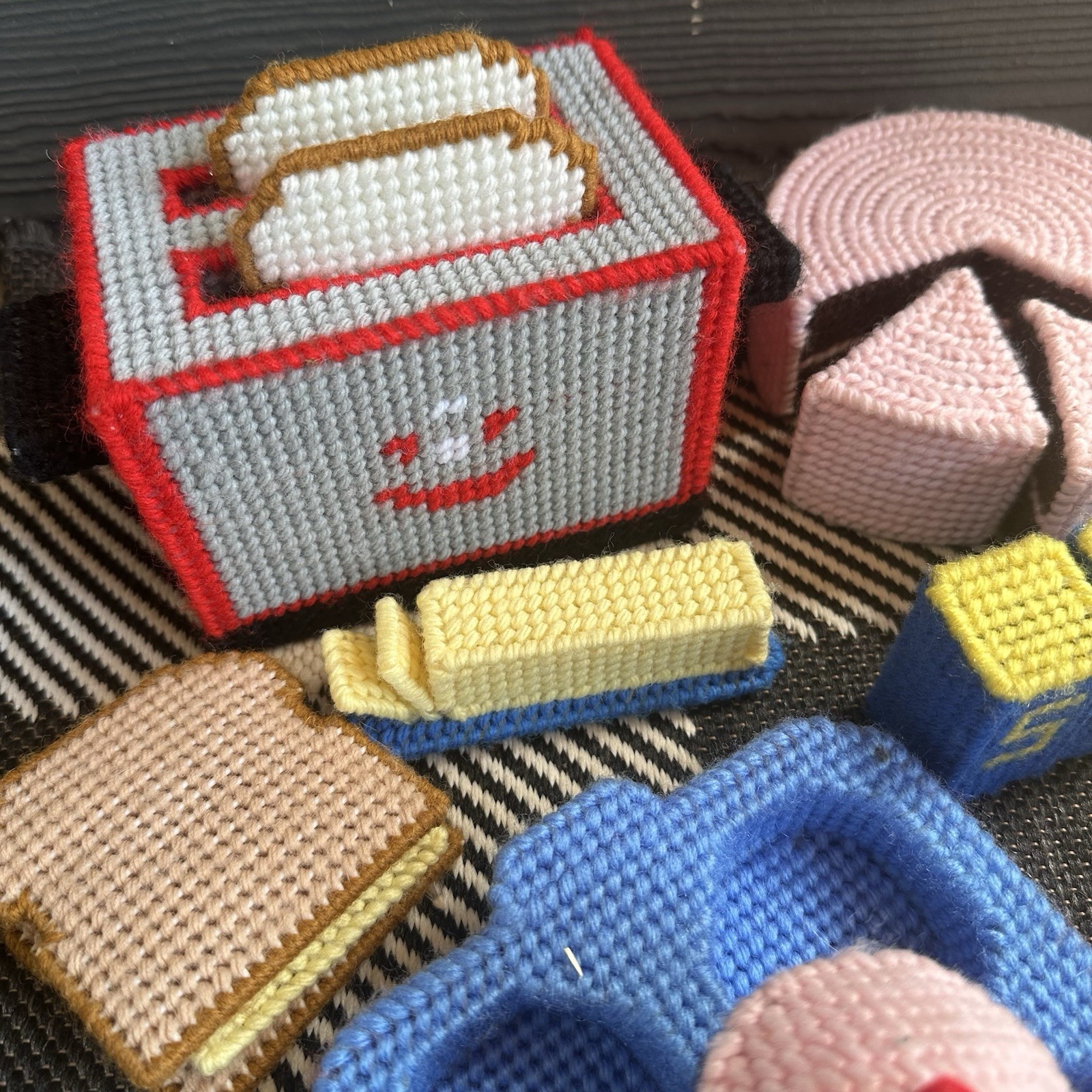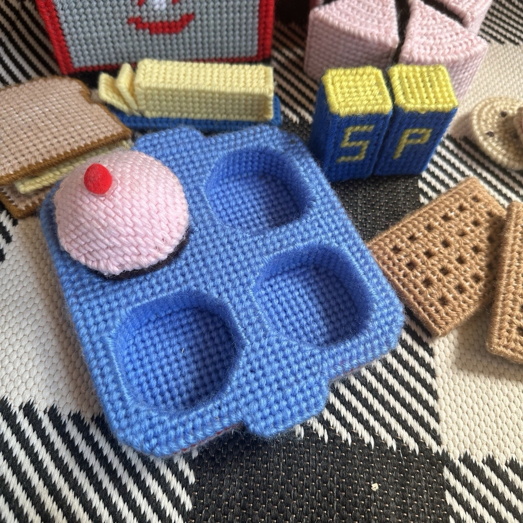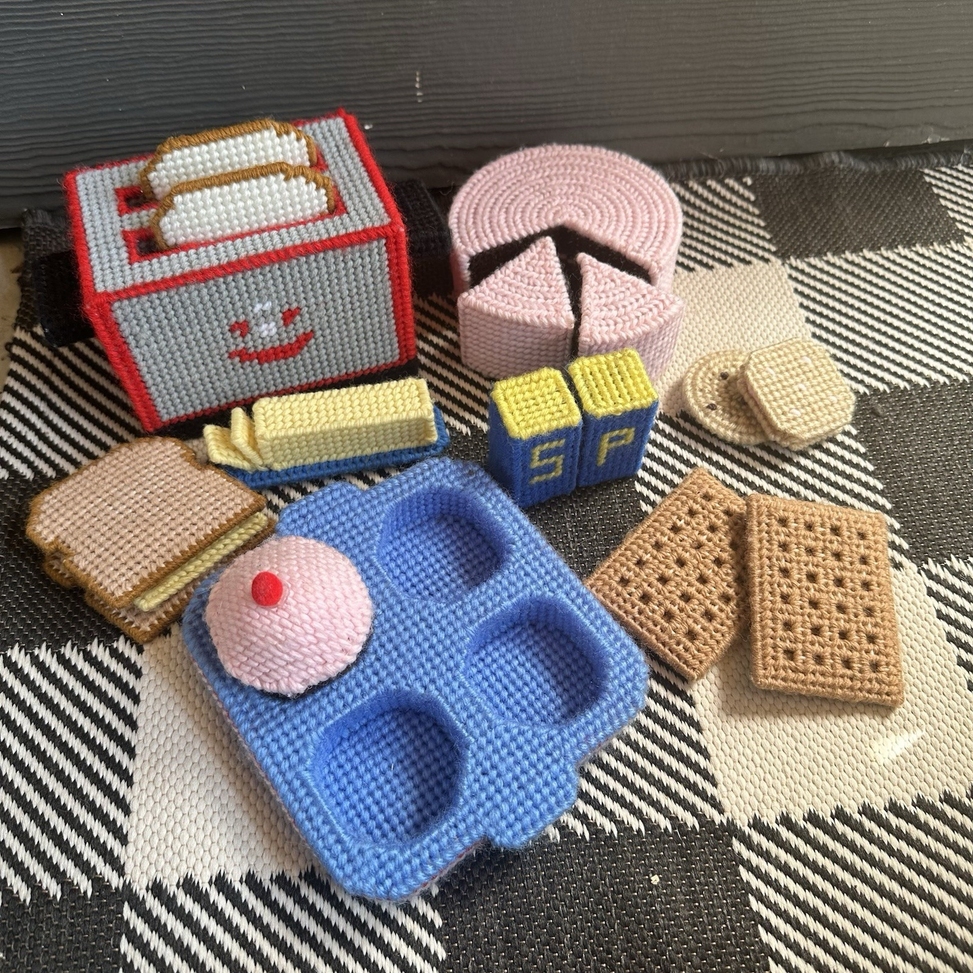 Vintage Plastic Canvas Needlepoint Kitchen & Food items Toaster, Cake, Cookies, muffin, muffin tray, sandwich, butter, salt and pepper, crackers