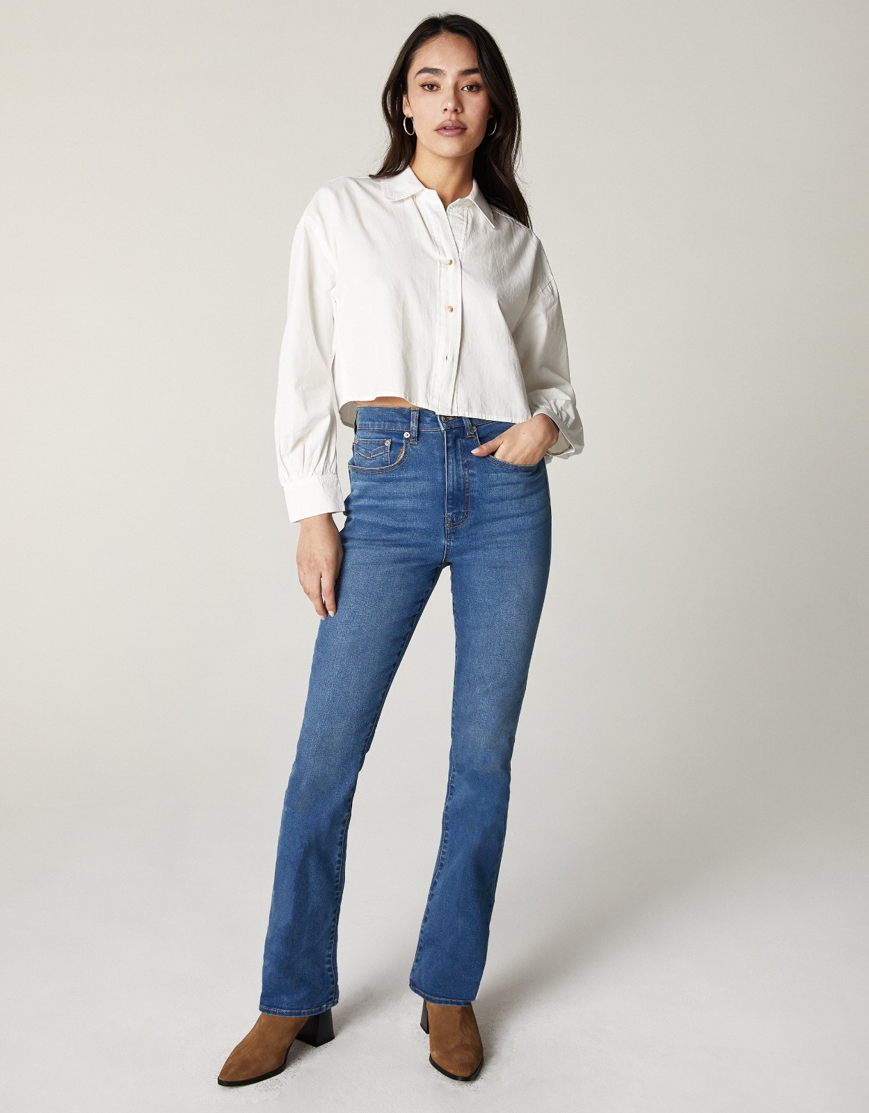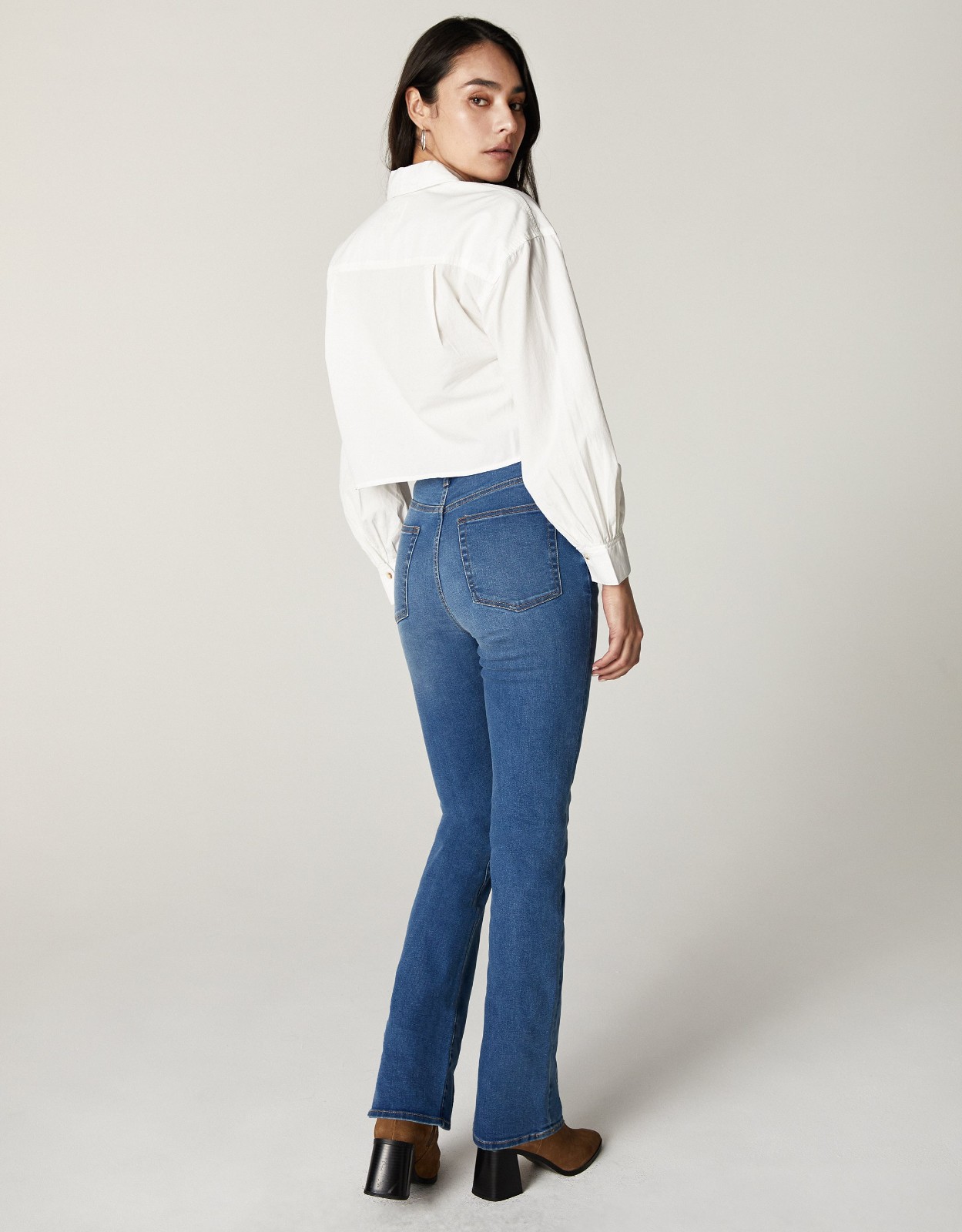 Chloe, the slim boot fit. High-rise and slightly flared below the knee. Featuring 5-pocket styling and antique nickel hardware.