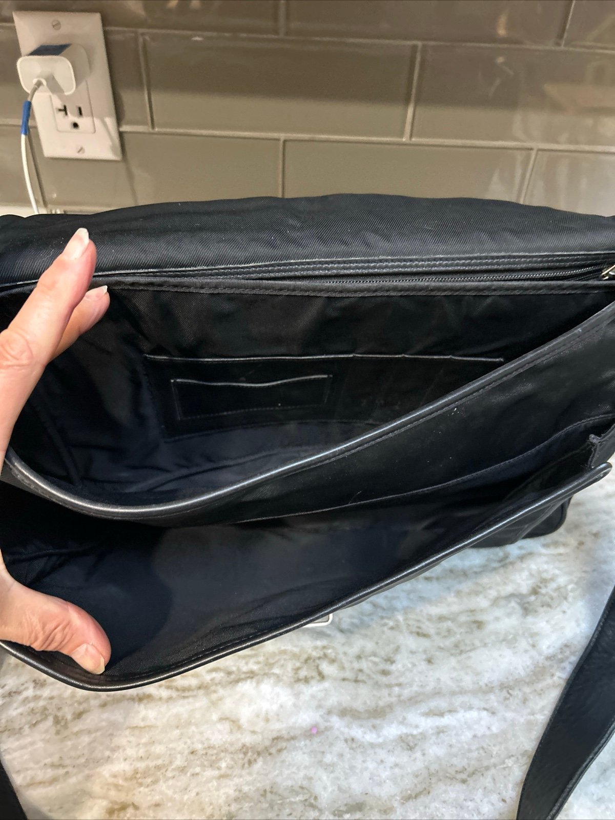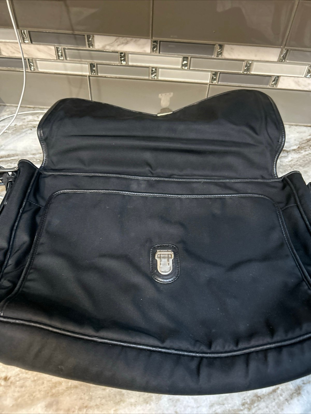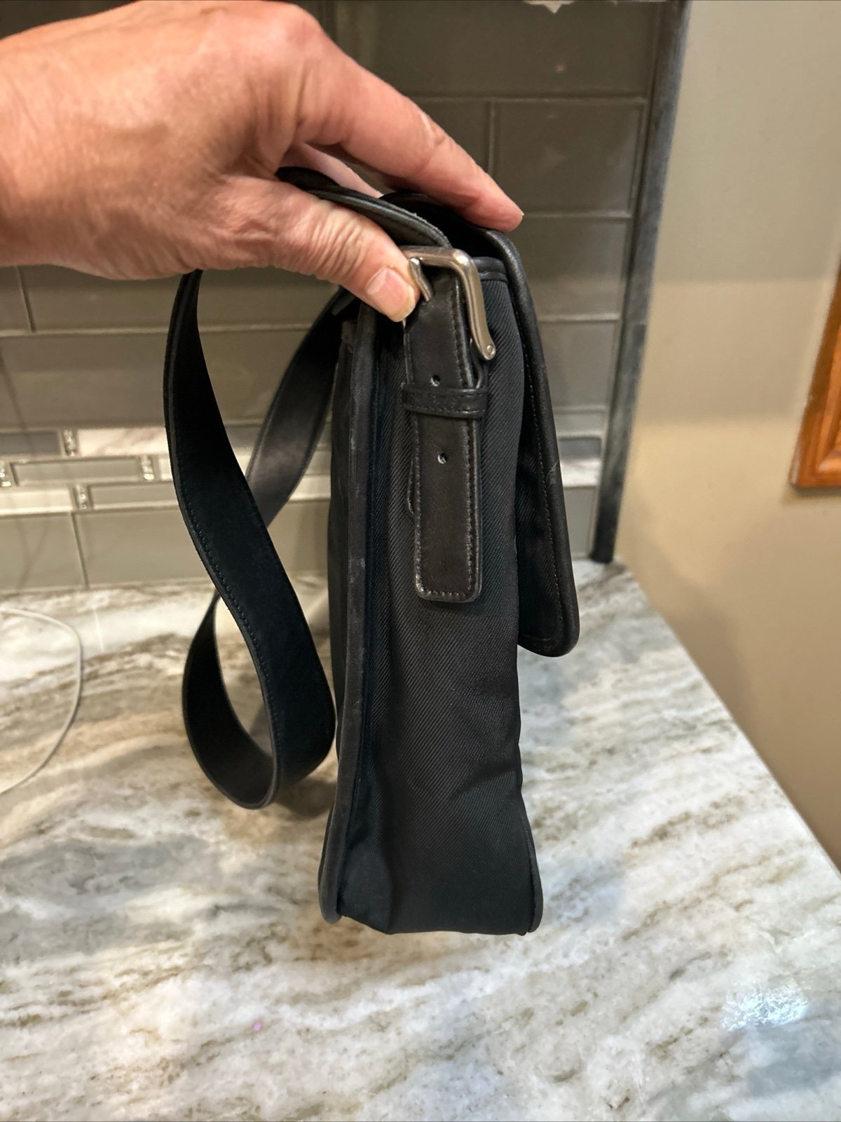 Smoke free home fast ship. Good overall condition with slight wear in leather trim . Lots of storage space . & pockets . Measures 11 inches high & 17 inches across . Long adjustable strap . Handle . Hang tag . Silver hardware.