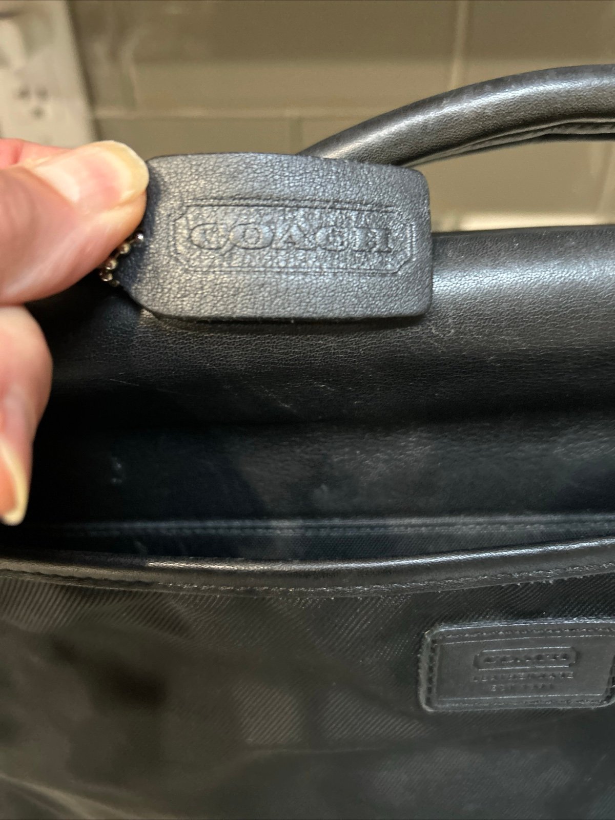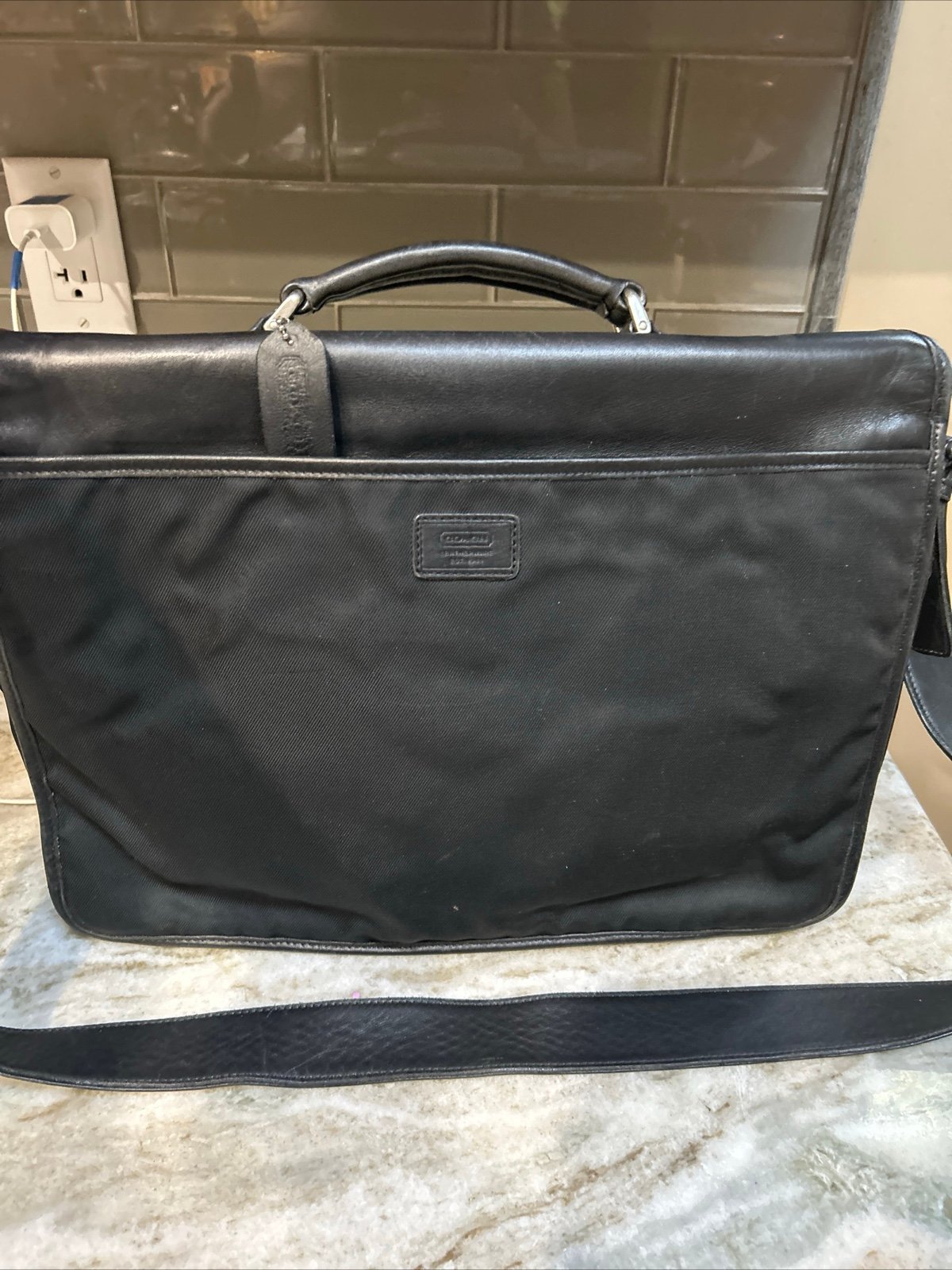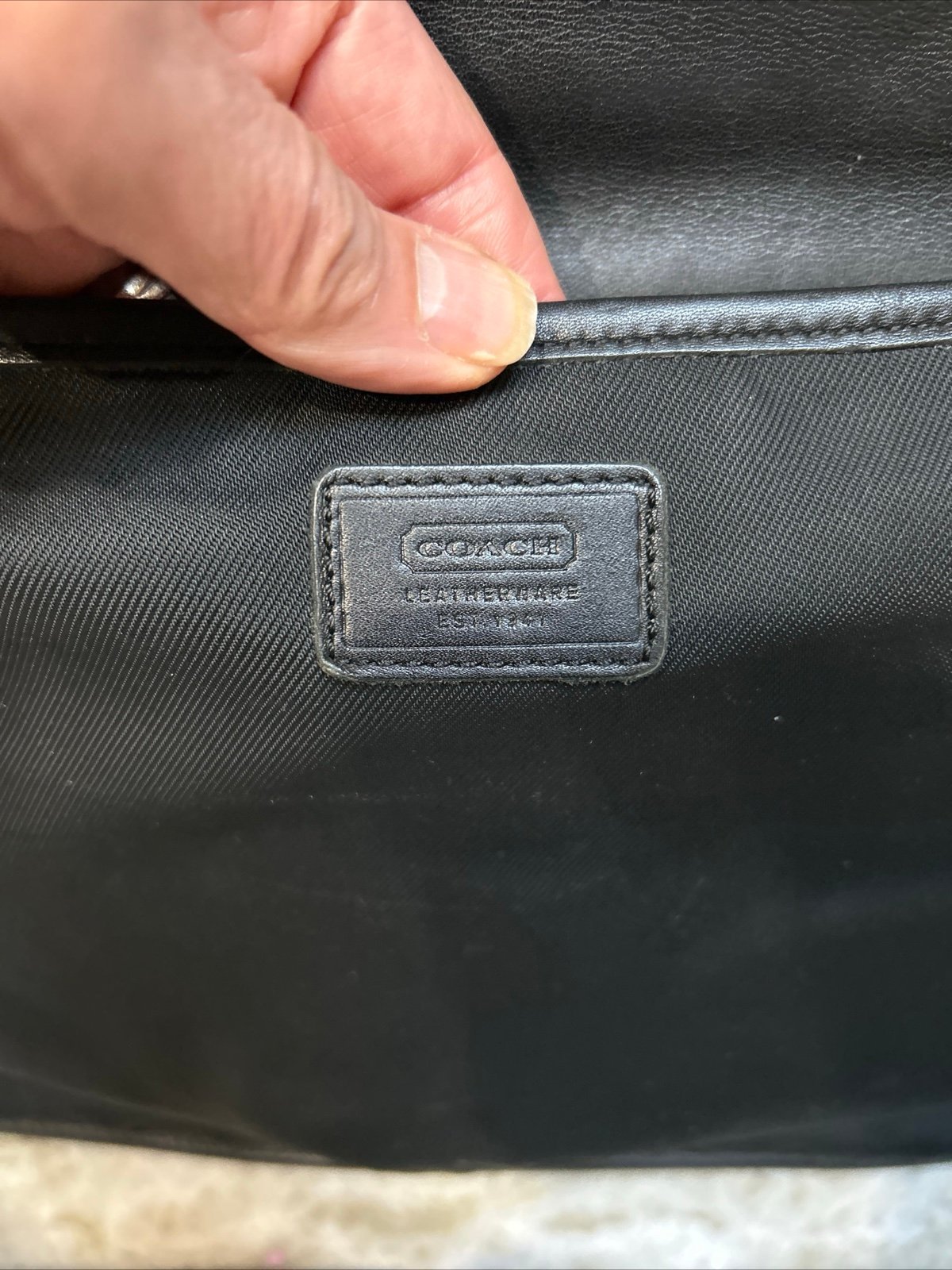 Smoke free home fast ship. Good overall condition with slight wear in leather trim . Lots of storage space . & pockets . Measures 11 inches high & 17 inches across . Long adjustable strap . Handle . Hang tag . Silver hardware.
