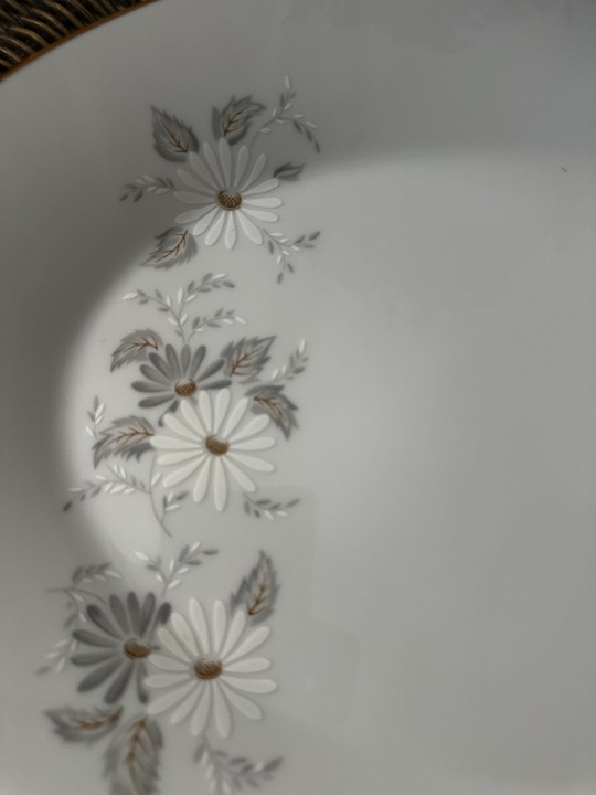 So lovely this pattern is with Delicate slightly raised flora motif with a gold tone edge matching the center of each flower
