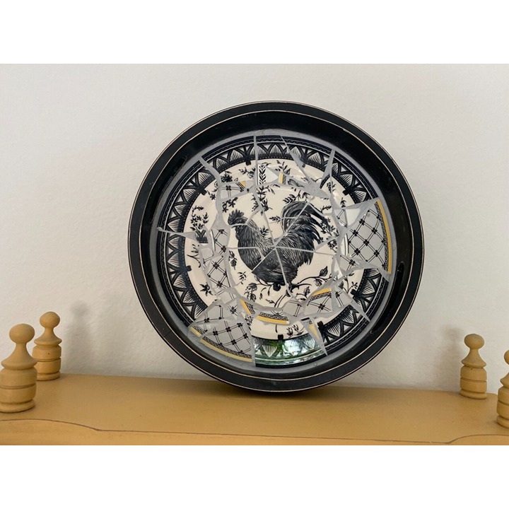 A charming, original design, influenced by the Farmhouse Rooster ceramic pottery pieces. The French call this "Picassiette", the art of Mosaic Shard Pottery: Created using antique, vintage and collectible pottery shards or remnants. Colors of black, white, pale gray, and a touch of yellow. An interesting hostess tray to serve your guests cocktails, beverages, etc. Display for that endearing English coastal cottage vibe.