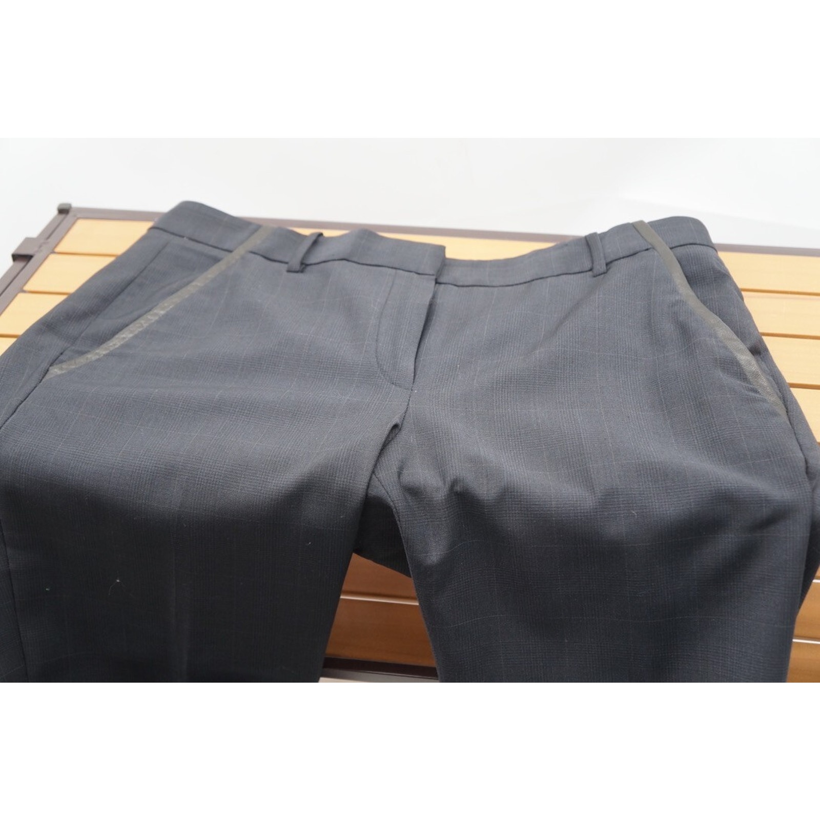 The product is a MAJE Women's Dulk Black Leather Trims Blazer in size 38 and pants in size 30. This set includes a two-piece blazer with a black check pattern, long sleeves, and a short jacket length. The blazer features a single-breasted design with one-button front closure, making it a stylish and versatile addition to any woman's wardrobe. Made of lightweight material, this blazer is perfect for wearing in the summer, fall, or spring seasons.