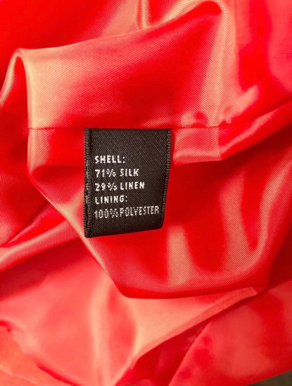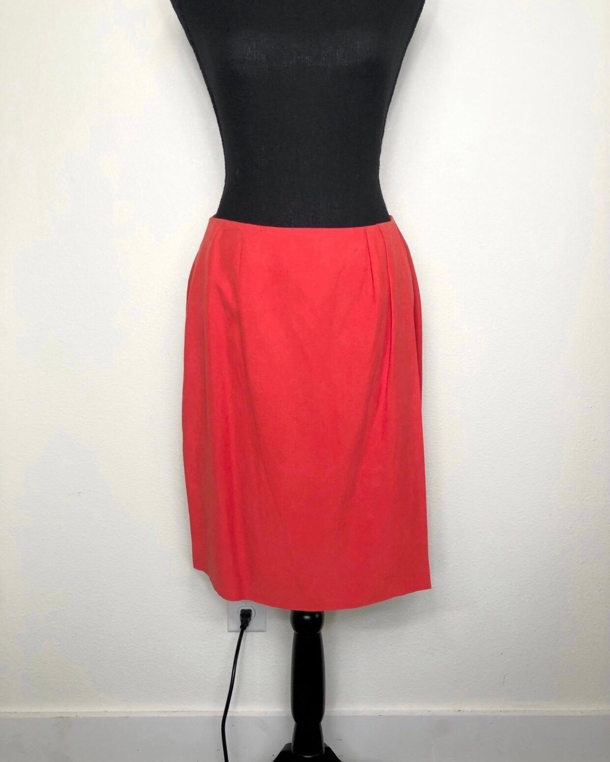 Two piece blazer and skirt suit set by Josephine Chaus Petite. Silk-linen blend for a comfortable wear in Summer time. Orange-red in color. Both internally lined.