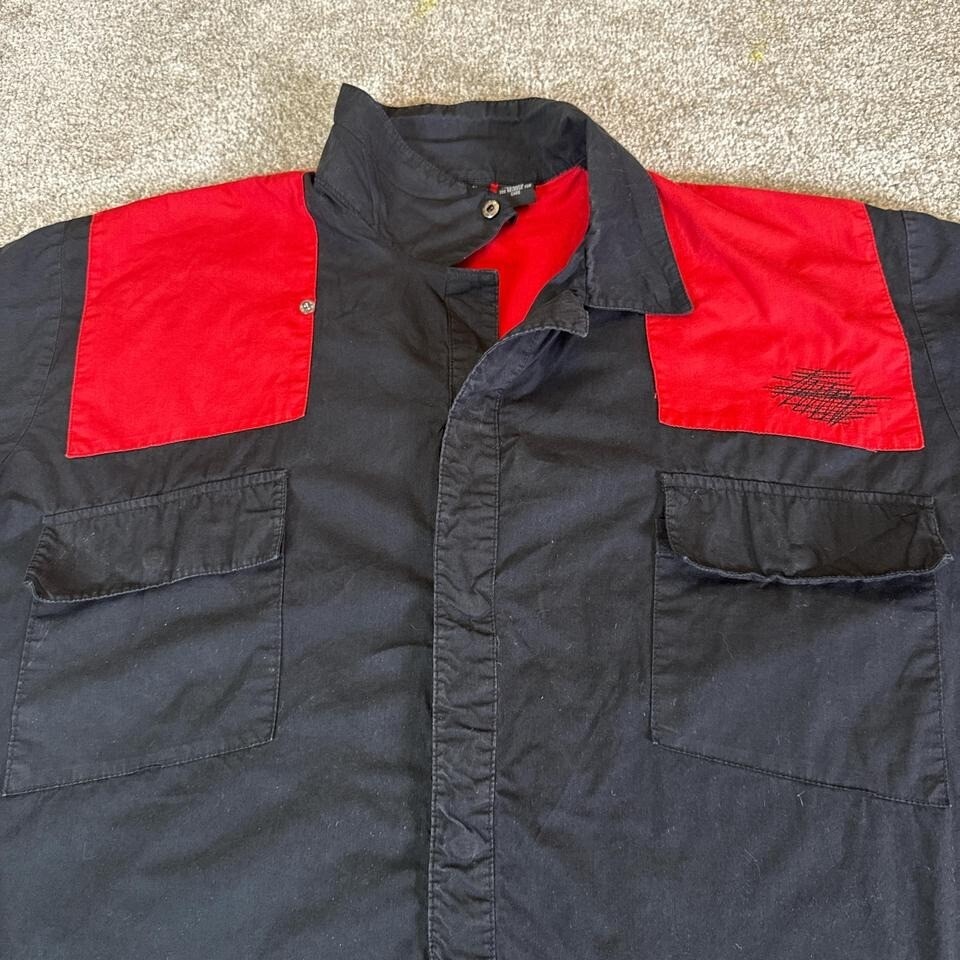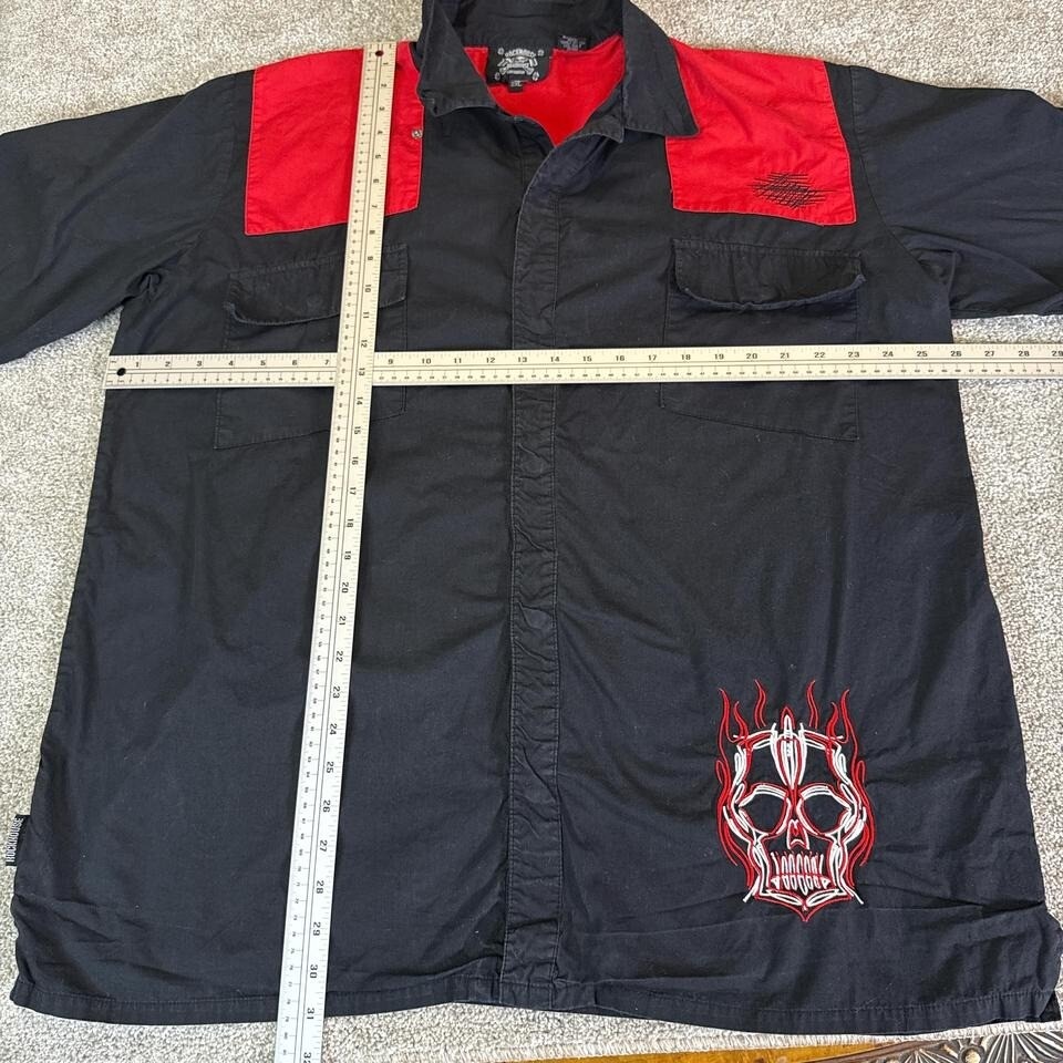 Unleash bold energy with this Vintage ROCKHOUSE Road House Los Angeles biker shirt in men's 2X. This button-down features striking embroidered flames, skulls, and blood-red accents that embody the raw spirit of biker culture. Crafted for comfort and edge, it's ideal for rallies, concerts, or standout streetwear. The Los Angeles detail adds extra collectible appeal to this rare piece of biker fashion.