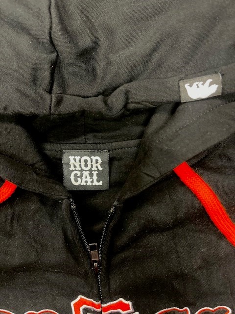 Brand new with tag, men’s San Francisco Giants NOR CAL hoodie sweatshirt. Full zip, 2 hand pockets in the front. Black color, with orange drawstrings and large NOR CAL spellout across the chest on the front. Fully lined, 100% cotton lining. 80% cotton, 20% polyester blend exterior. Original tags and SF Giants Dugout price sticker still attached.