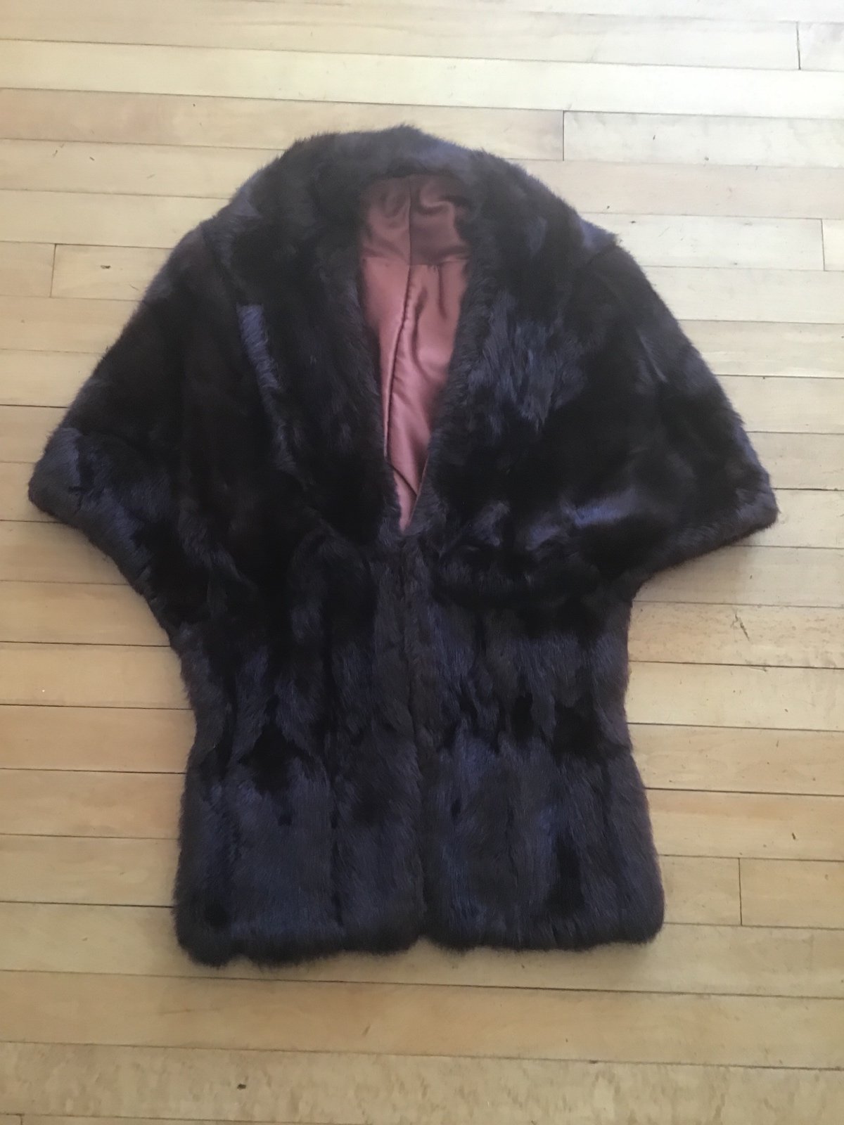 Vintage Dark Mahogany color mink fur shrug/ shawl/ stole. Button clasp. 2 front side pockets. Satin lined. Satin Lined stand up collar. Shoulder to shoulder=18”. Collar to hem=28”. Across the back=27”. Beautiful dark brown mink fur, no tears or stains. Beautiful Carmel color satin lining, no tears or stains. No identification labels.