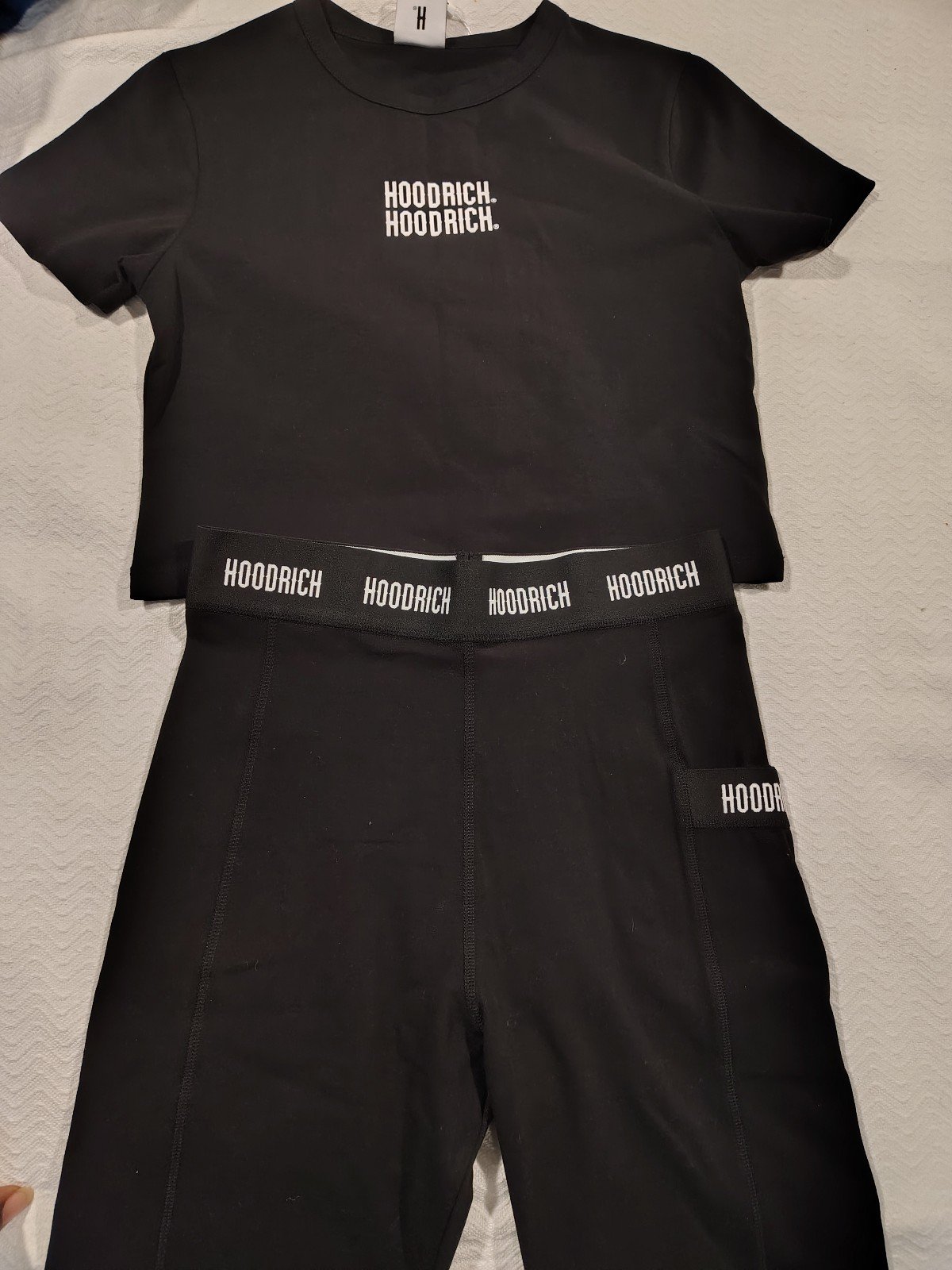 This is a women's Hoodrich biker shorts and top set featuring a tape logo design. The set is in black color and made from 95% cotton and 5% elastane for the shorts, and 100% cotton for the top. The waist sizes available are S (26"-27")..The style is biker, suitable for activewear occasions.