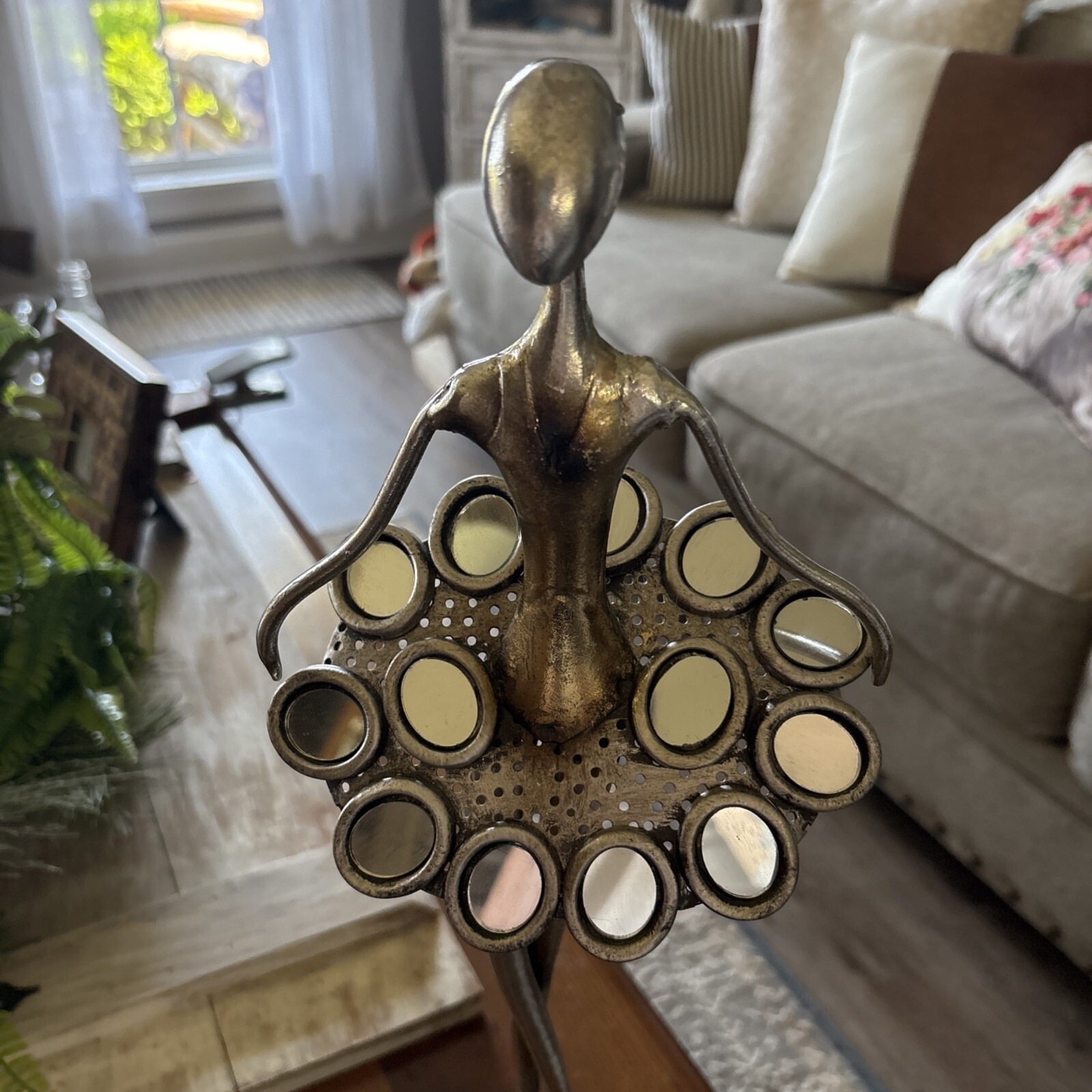 This Silver/Gold Tone Metal Ballerina Sculpture stands at 2ft tall, making it a large and striking piece of art. The sculpture showcases intricate metalwork, depicting a graceful ballerina form with a whimsical design. The use of metal as the material adds a touch of elegance and durability to this original piece, making it a standout addition to any art collection.