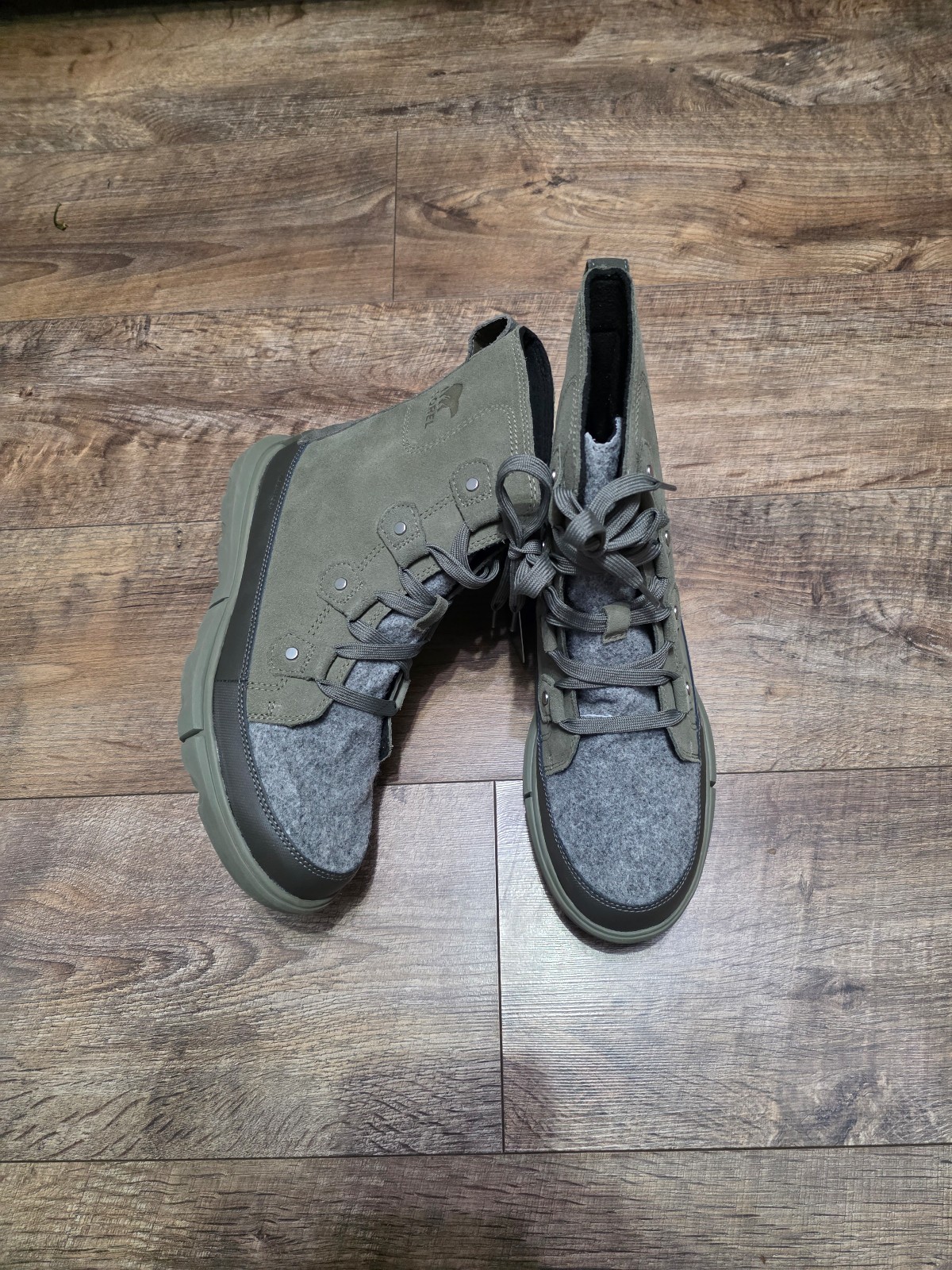 New Sorel Explorer insulated waterproof boots without box . Excellent condition and quality. Stylish and durable boots featuring a sleek gray and green design. Perfect for everyday wear. Great fall, winter and spring weather. Women's size 9.5
