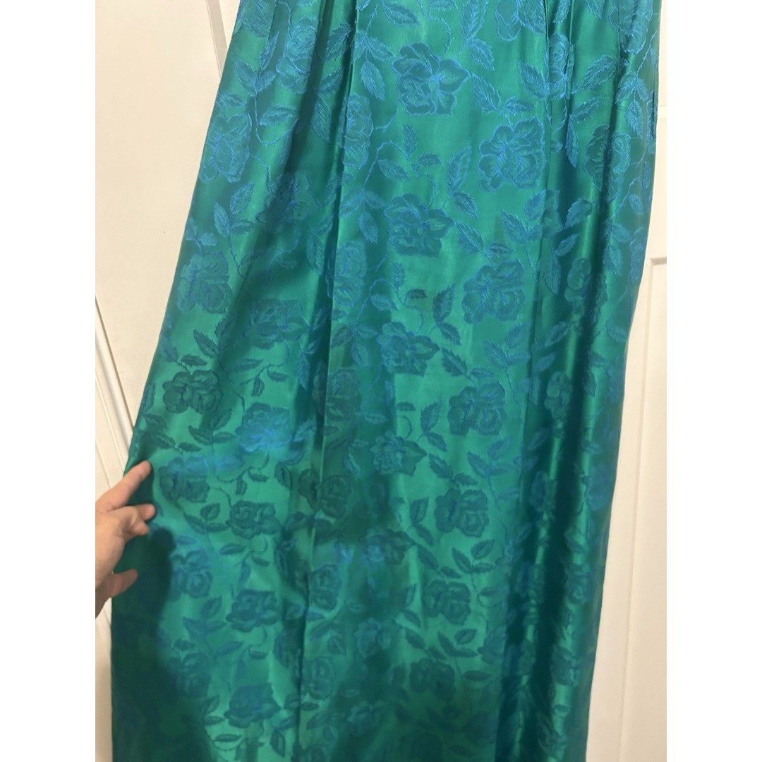 This vintage 1950's original blue green brocade fitted long gown is a formal costume perfect for theater or costume events. Made in the United States, this gown features a unique brocade material in a striking green color. With a size small chest of 28", waist of 24", and hip size of 40", this gown exudes a classic eveningwear look of the 1950s era. Perfect for special occasions, this modified item is sure to make a statement with its original and timeless design.