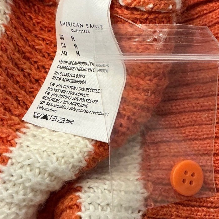 Infuse your wardrobe with a touch of preppy charm! This American Eagle sweater features bold orange and white stripes in a cozy knit texture that's perfect for layering. The classic collared design with a three-button placket adds a sophisticated touch, while the fitted silhouette offers a flattering, modern look. Imagine yourself strolling through a crisp autumn day, apple cider in hand, or enjoying a relaxed weekend brunch with friends. This versatile sweater is equally at home paired with jeans for a casual outing or dressed up with a skirt for a more polished ensemble. It's the perfect piece to transition between seasons with ease and style.