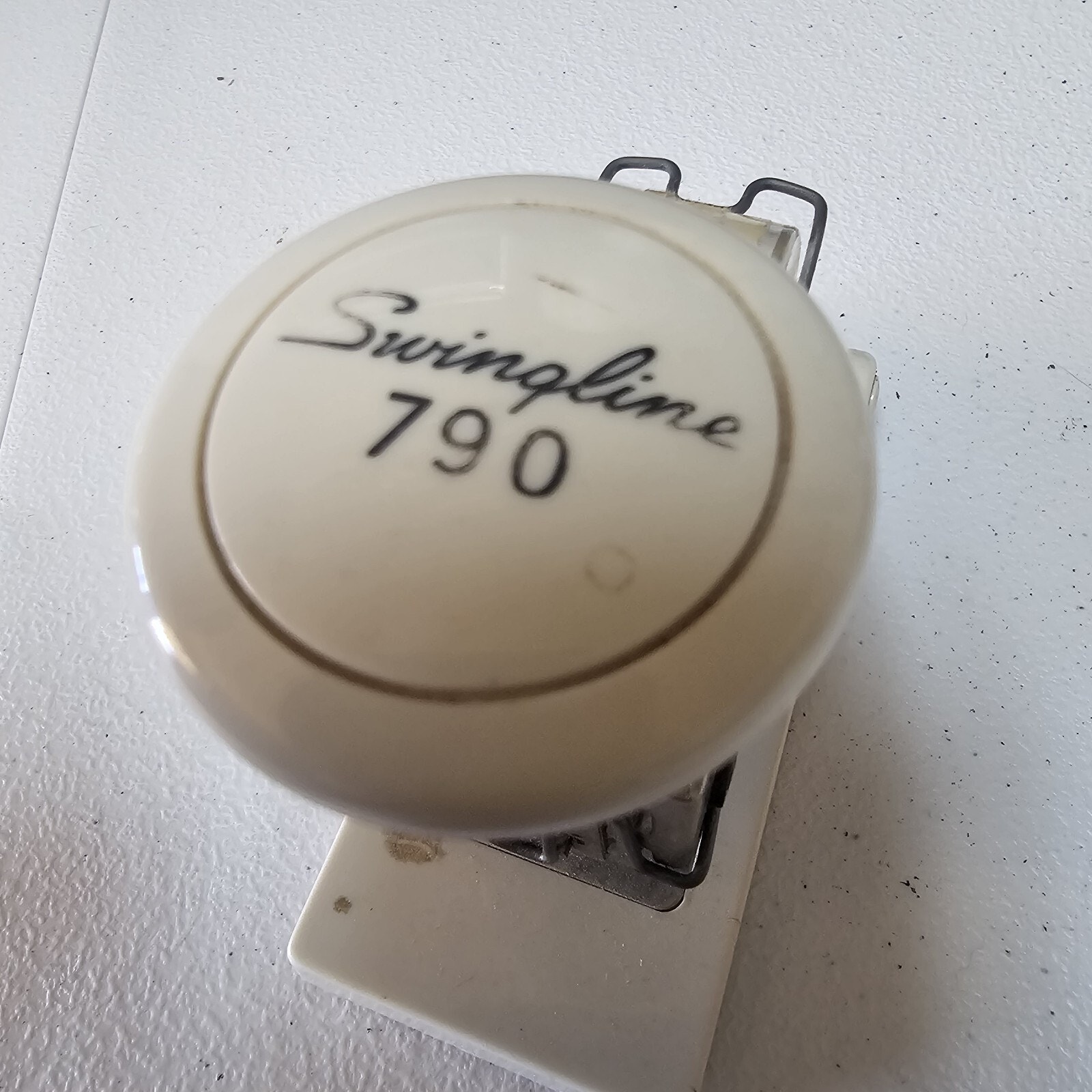 This vintage Swingline stapler is a must-have for any collector of desktop items. With its stylish design and durable materials, it is sure to impress. Made of steel and plastic in the United States, this stapler was built to last. It is not handmade, but it is a vintage piece that will add charm to any desk. The stapler uses the 5000 cartridge and can hold up to 100 staples. It is in excellent working condition and ready to be used or displayed. Add this unique collectible to your desktop items collection today.