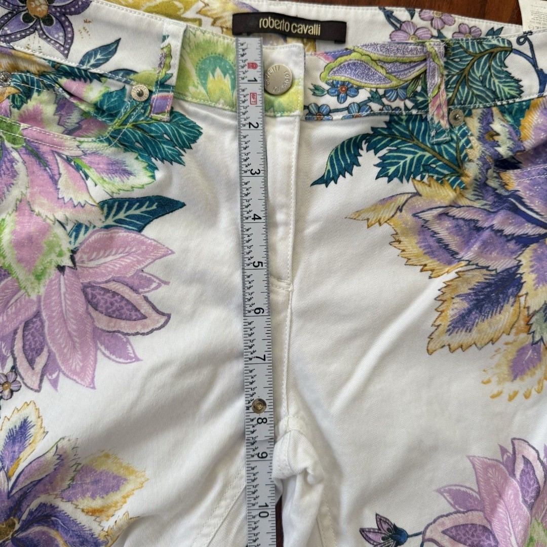 Rare!! Has very faint mark on back not too noticeable please see photos thank you These Roberto Cavalli Floral Print Pants are a rare find, made in Italy with a beautiful multicolor floral pattern. The pants feature a zip and button closure, a mid-rise fit, and a cropped 24.5-inch inseam. Made from a comfortable blend of spandex and cotton, these pants also have a 5-pocket design with the brand's logo throughout for added detail. Perfect for the summer, fall, or spring seasons, these designer pants are sure to make a stylish statement with their unique 90s-inspired theme.