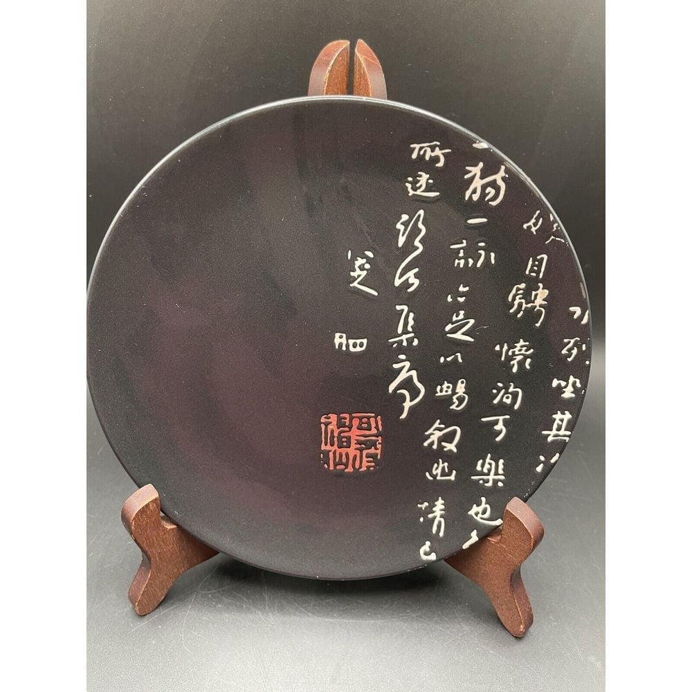 This vintage Kafuh Japanese black porcelain plates feature inscriptions that add a unique touch to their design. The plates reflect traditional Japanese culture with their intricate detailing and craftsmanship. Made in Japan, these plates are a collectible item that showcases the beauty and artistry of Japanese porcelain. Please see pictures for details
