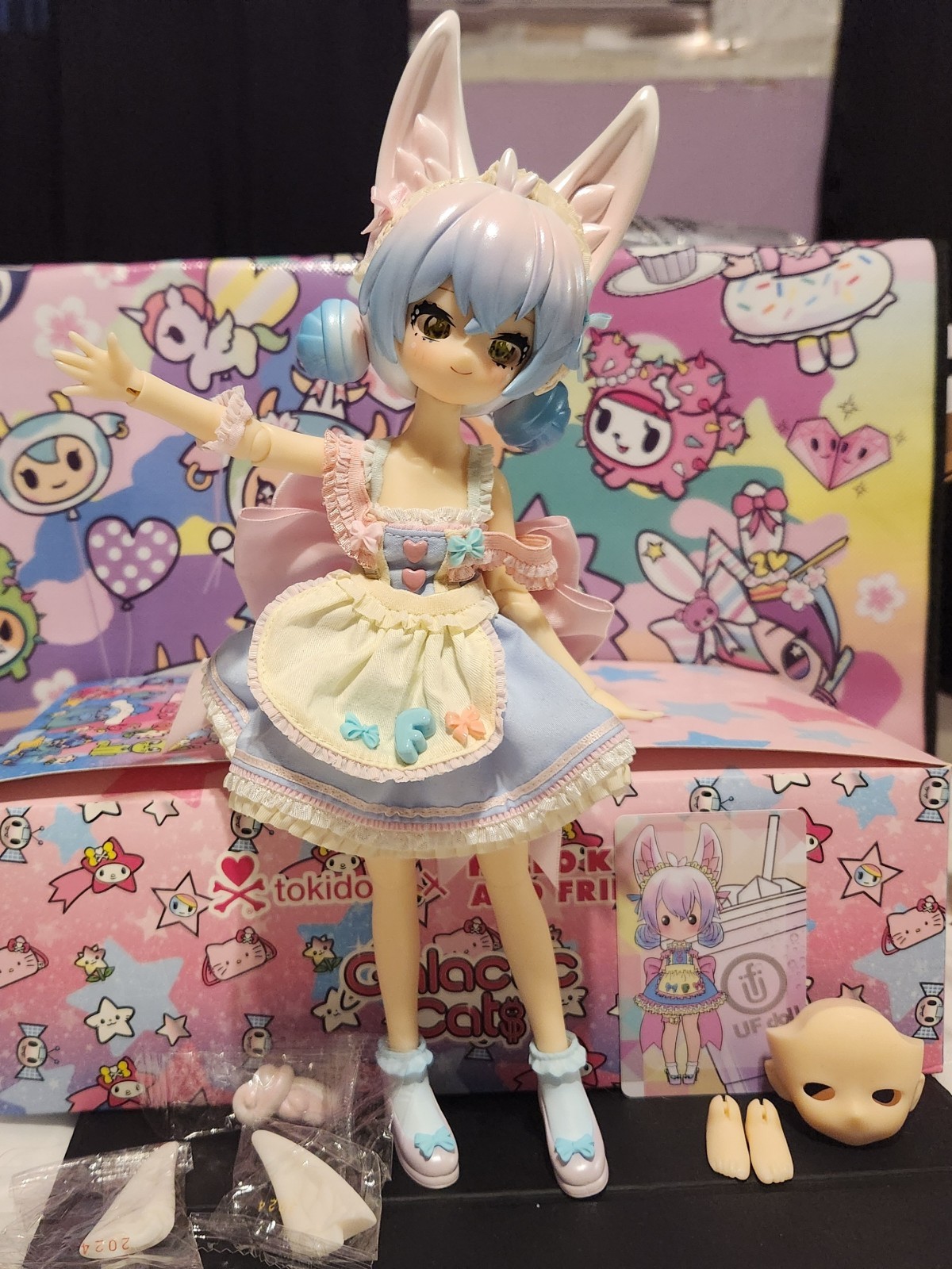 A UFDoll branded 1/6 scale ball jointed doll. This is from a series called Tea Party, and she is the Colorful Fruit Tea color way. She does not come with her gloved hands. Though she does come with an extra head, blank ears, flat feet, hair pieces, and her ID card. Only purchased and opened then put in to storage.