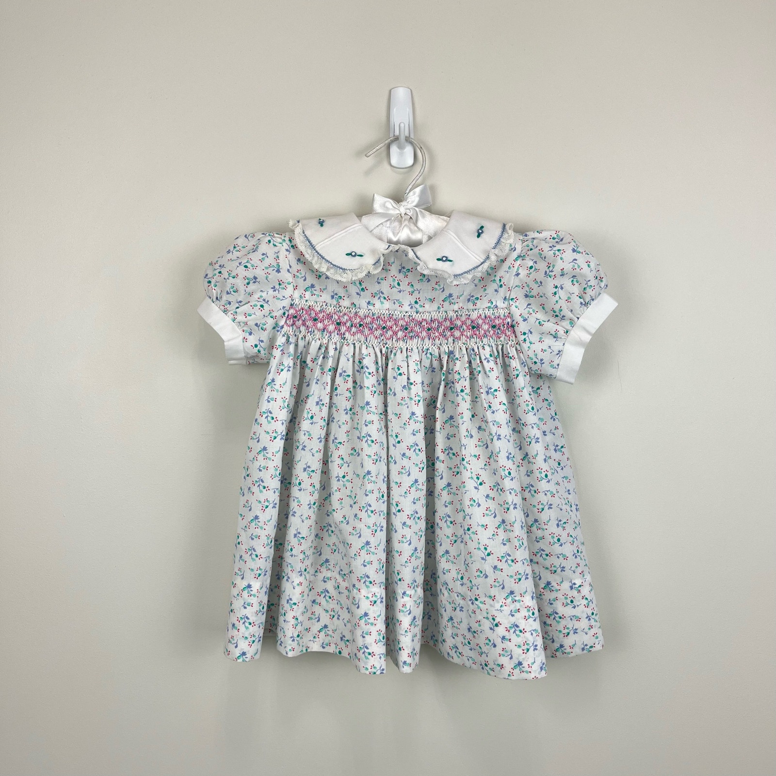 Vintage Alison Scott Smocked Floral Dress. Baby toddler girl size 24 months. Short sleeve dress with pink smocking across the chest and lace lined collar with embroidered flowers. Buttons in the back. Perfect for Easter or a spring party!