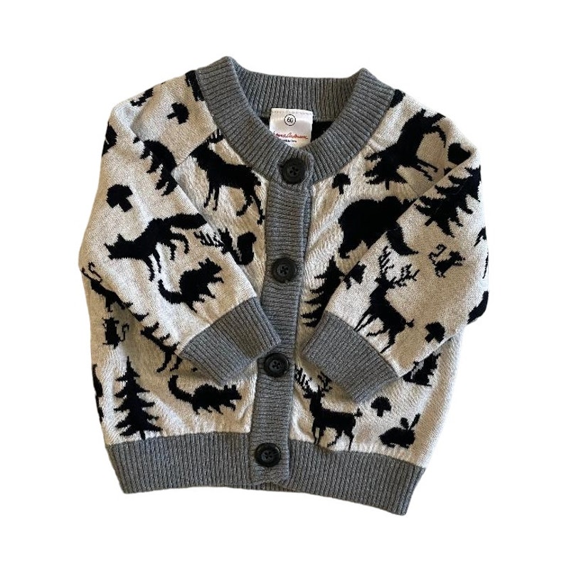 Hanna Andersson Woodland Animal Tree Sweater/Cardigan Print in Light Gray with Black Buttons