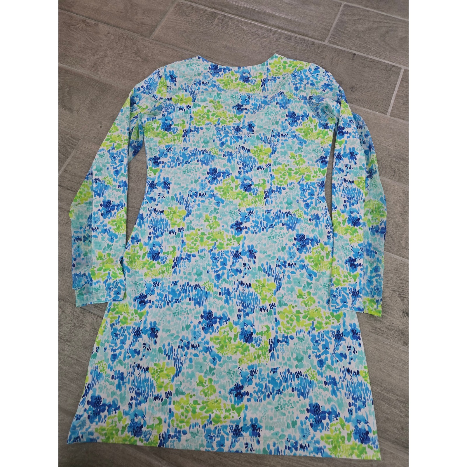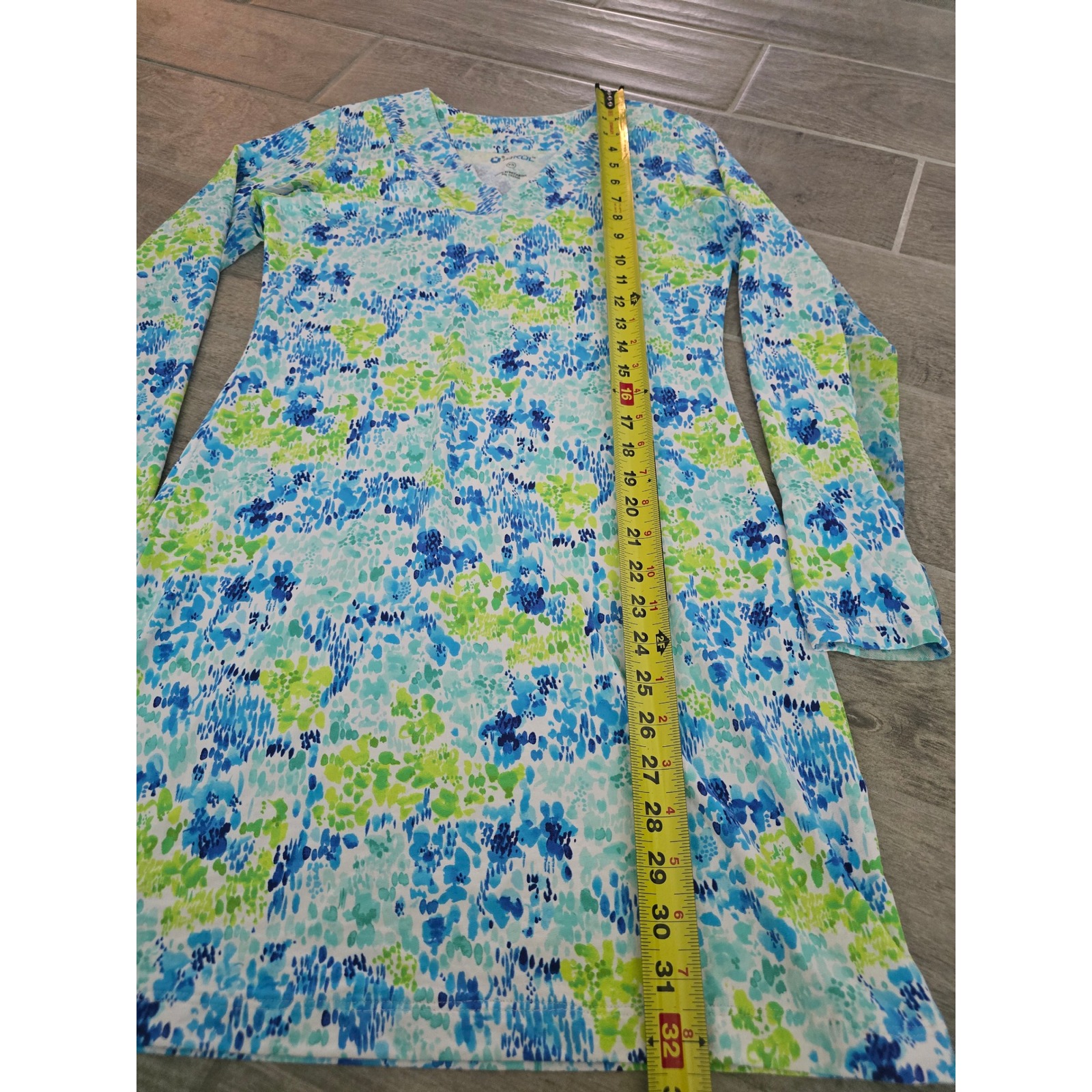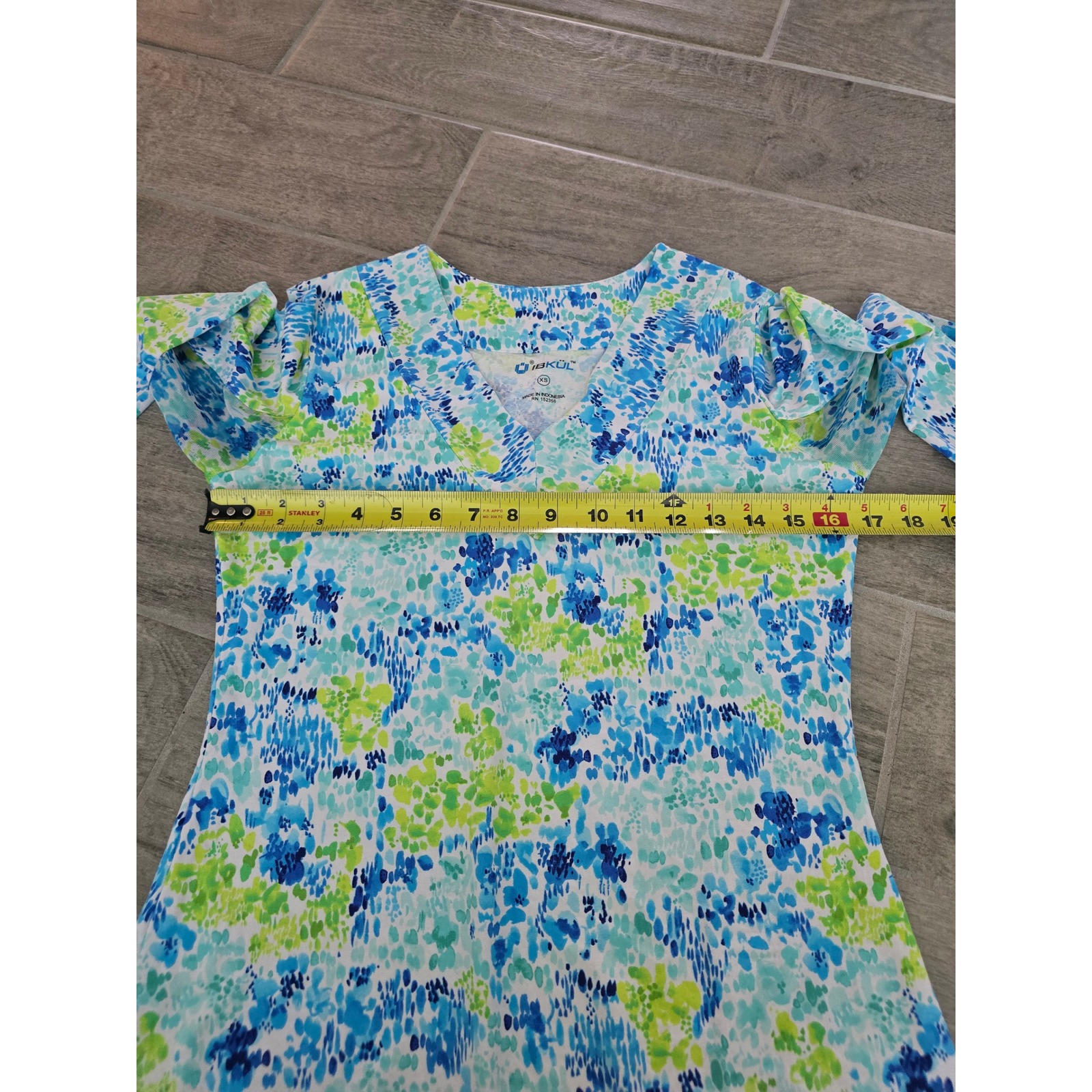 IBKUL sun protective dress, a stylish and functional piece designed for outdoor activities. This dress features a vibrant floral print in shades of blue and green, offering a fresh and eye-catching look. With long sleeves and a V-neck, it provides ample coverage and a flattering silhouette. Perfect for golf outings, beach trips, or casual outdoor gatherings, this dress combines fashion with sun safety.
