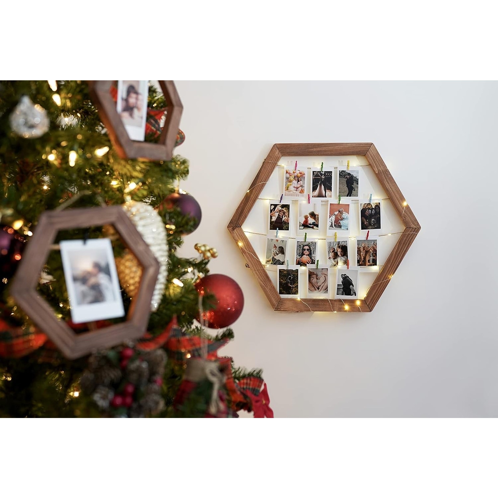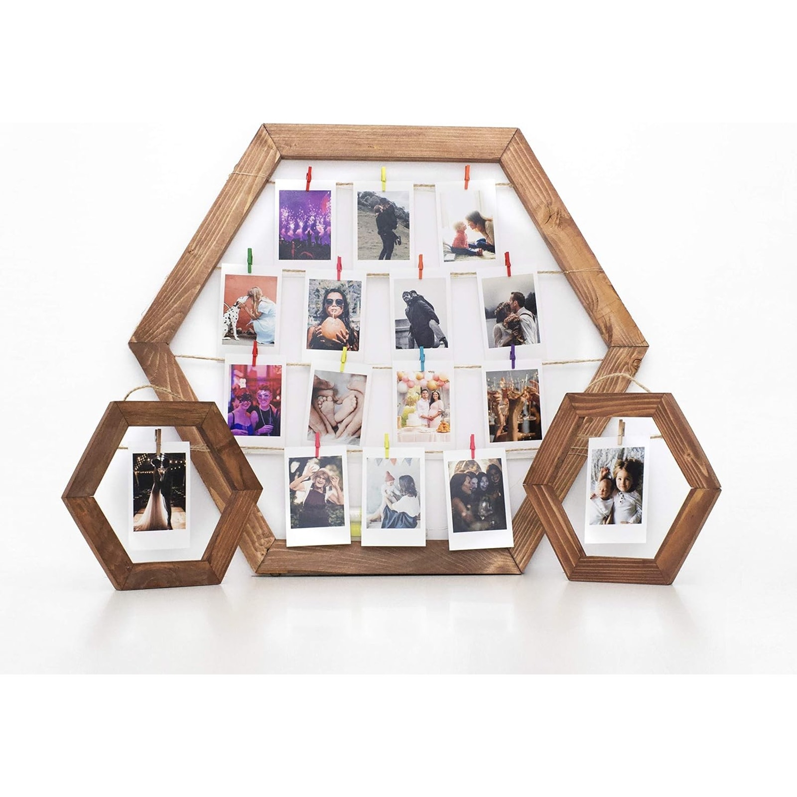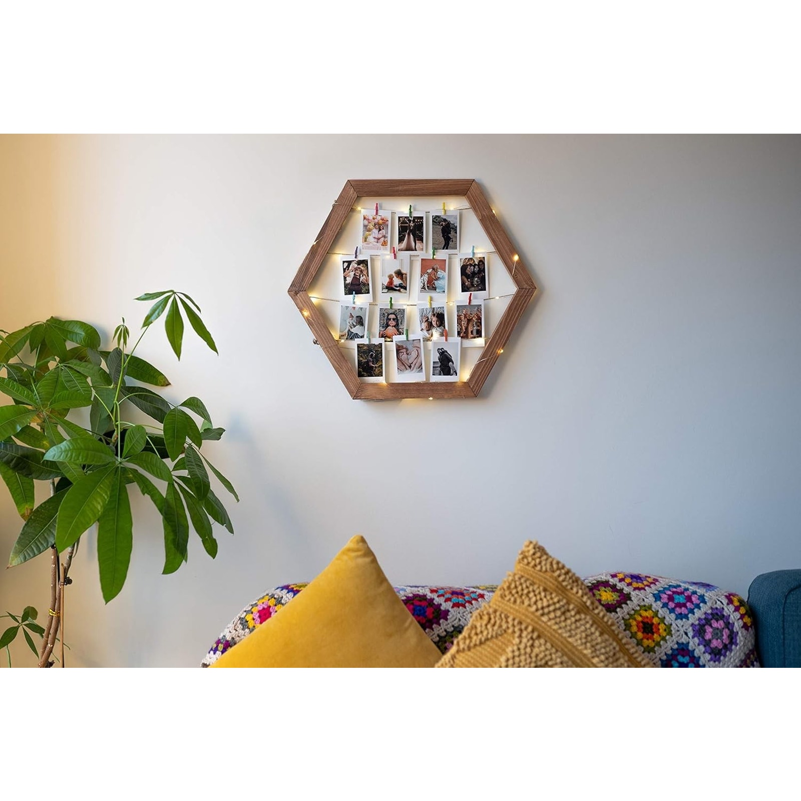 Unique Look We don t look classic! Wooden picture board adds a nice and authentic appearance and honeycomb design will look amazingly smooth on your wall d cor. Pixogo collage picture frames created for the optimal amount of photos. Polaroid picture display can have 14 of 2,5-4 inch polaroid photos which are easy to order from big market photo centers. Smart Design It is absolutely a distinctive hanging photo display! Pixogo picture frames have lines behind them to keep everything tight and neat. Twine rope and string lights will line perfectly on the picture board after assembling by the user instruction manual. Solid Structure Pixogo uses the best part of the wood to create a solid picture frame collage. With 3.5 cm thickness, it doesn t bend easily and stays as long-lasting hanging picture frames for your room decor. Best Gift Ever You will see the shining on their eyes when loved ones receive it. It is good to show your significant other that you do care moments with them.