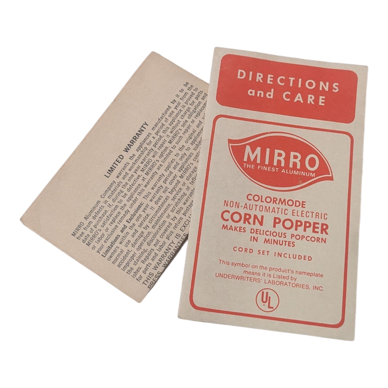 A vintage Mirro Colormode non-automatic electric corn popper, a piece of retro kitchenware that brings a touch of nostalgia to your home. Featuring a distinctive yellow finish, this corn popper includes the original instruction manual and warranty information. This appliance, designed for countertop use, boasts a simple yet functional design with black accents, including the lid handle and base supports. The popper's interior is made of aluminum, and the exterior is also finished in aluminum to match the top and side. A cord set is included. A vintage piece from Mirro, this popper offers a glimpse into the past with its unique aesthetic.