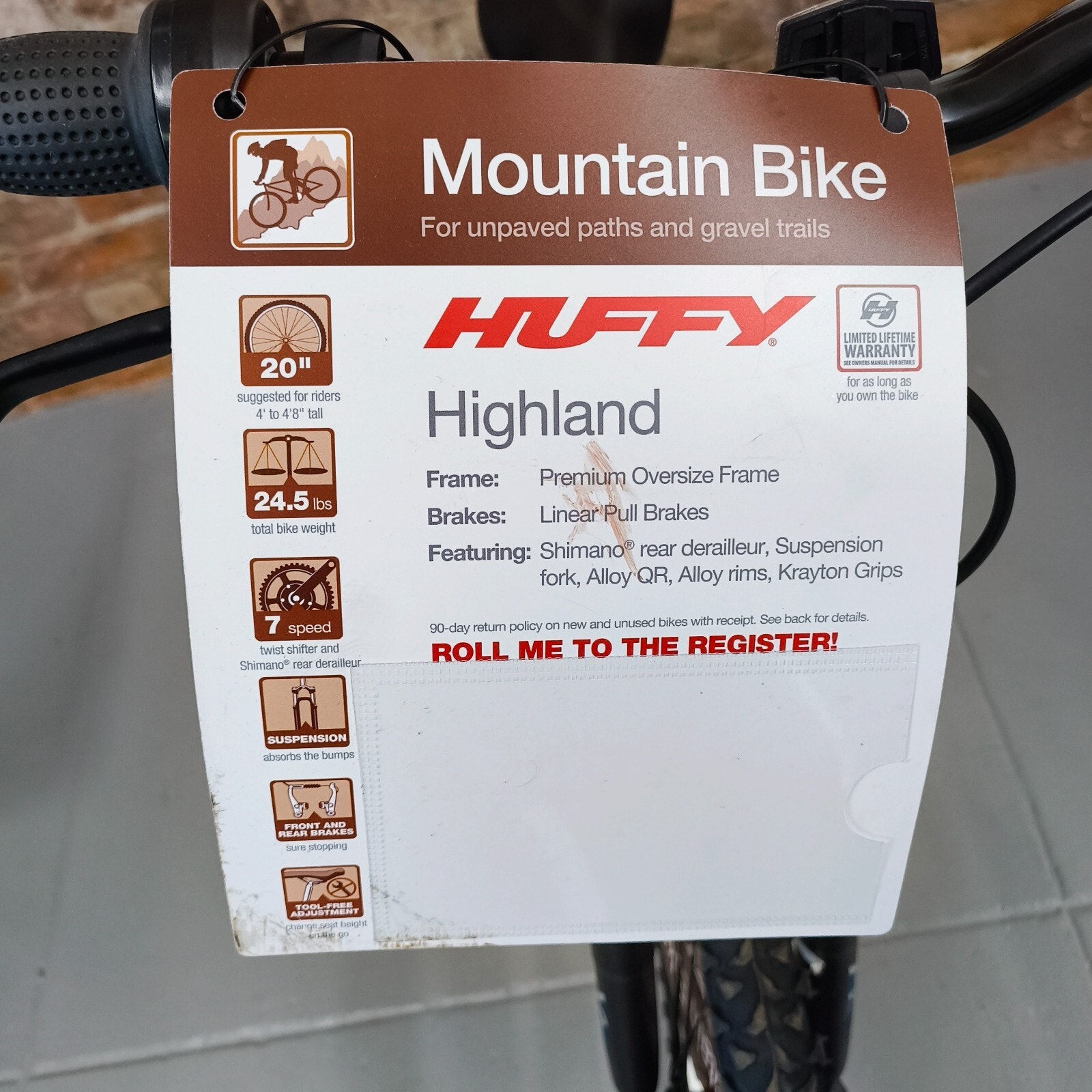 Huffy Highland 20-Inch Kids' Mountain Bike: Adventure-ready with a sleek emerald green frame and matte black accents. Built for kids 5+ (44-56 inches tall), this durable bike features a steel frame, Shimano 7-speed twist shifter, and rear derailleur for smooth gear shifts on hills and trails. The front suspension fork absorbs bumps, while knobby 20-inch all-terrain tires ensure stability on dirt, gravel, or pavement. Front and rear linear pull brakes provide responsive stopping power. Comfortable padded saddle for longer rides. Some assembly required.