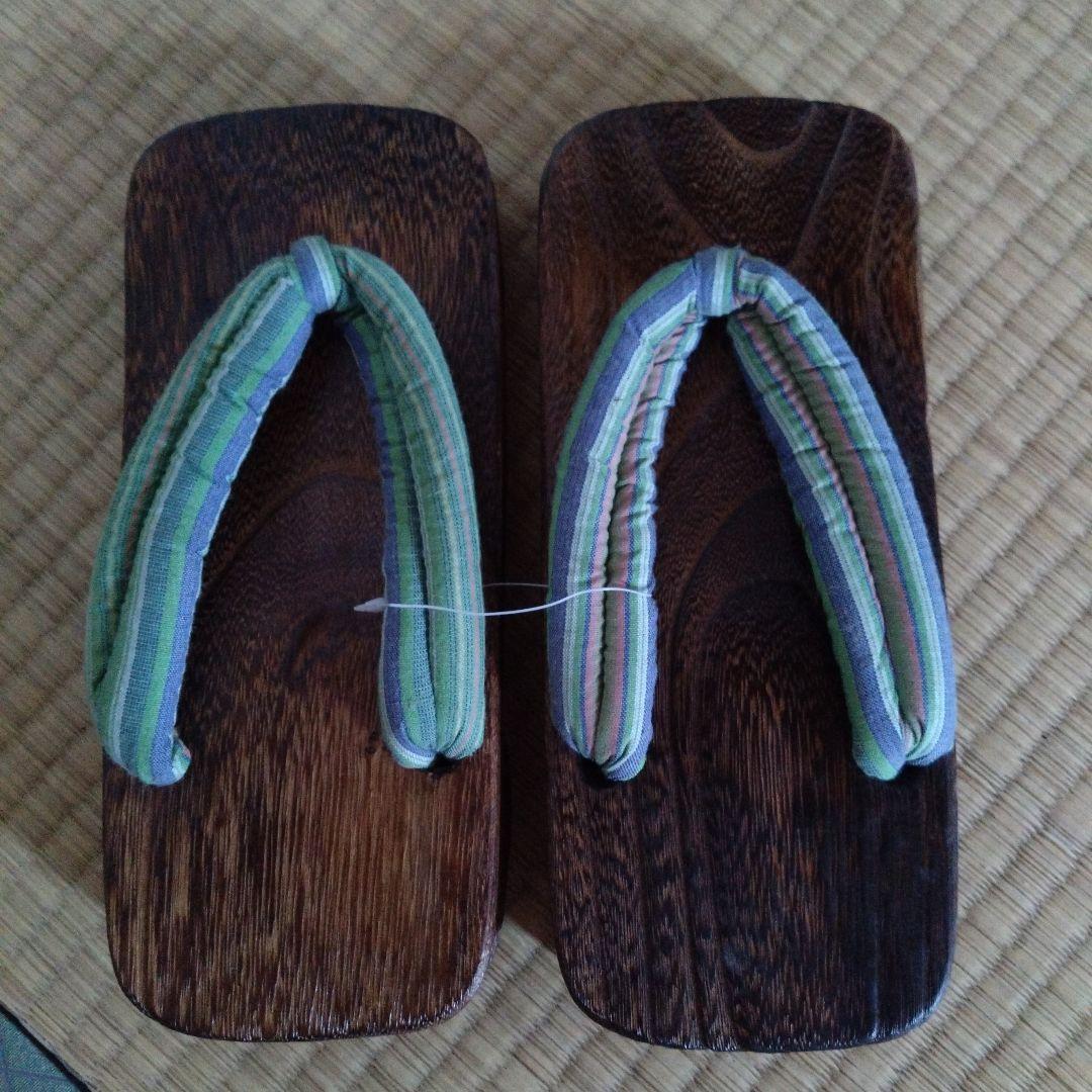 Wooden, dark brown geta (Japanese sandals) with striped thongs and non-slip soles.
