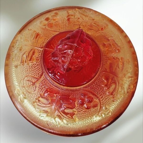 Add a touch of vintage charm to your home with this lovely footed covered candy dish from Jeannette's Harvest Grapes collection. Made of high-quality glass, this piece features a beautiful amberina color and a glossy finish that will surely catch your eye. The dish measures 4 1/4" in width and has one compartment, perfect for storing your favorite candies or trinkets.