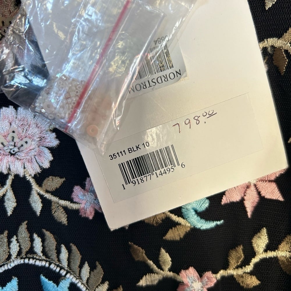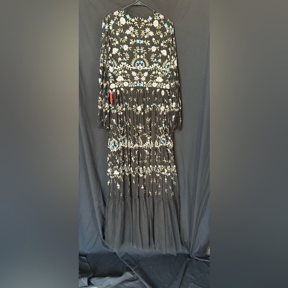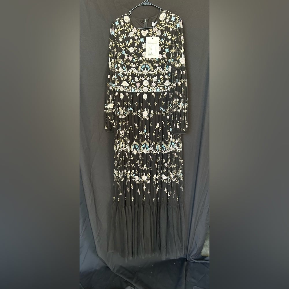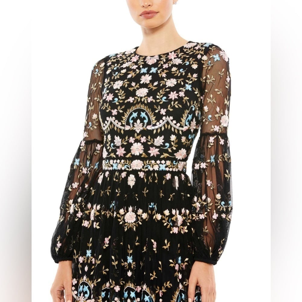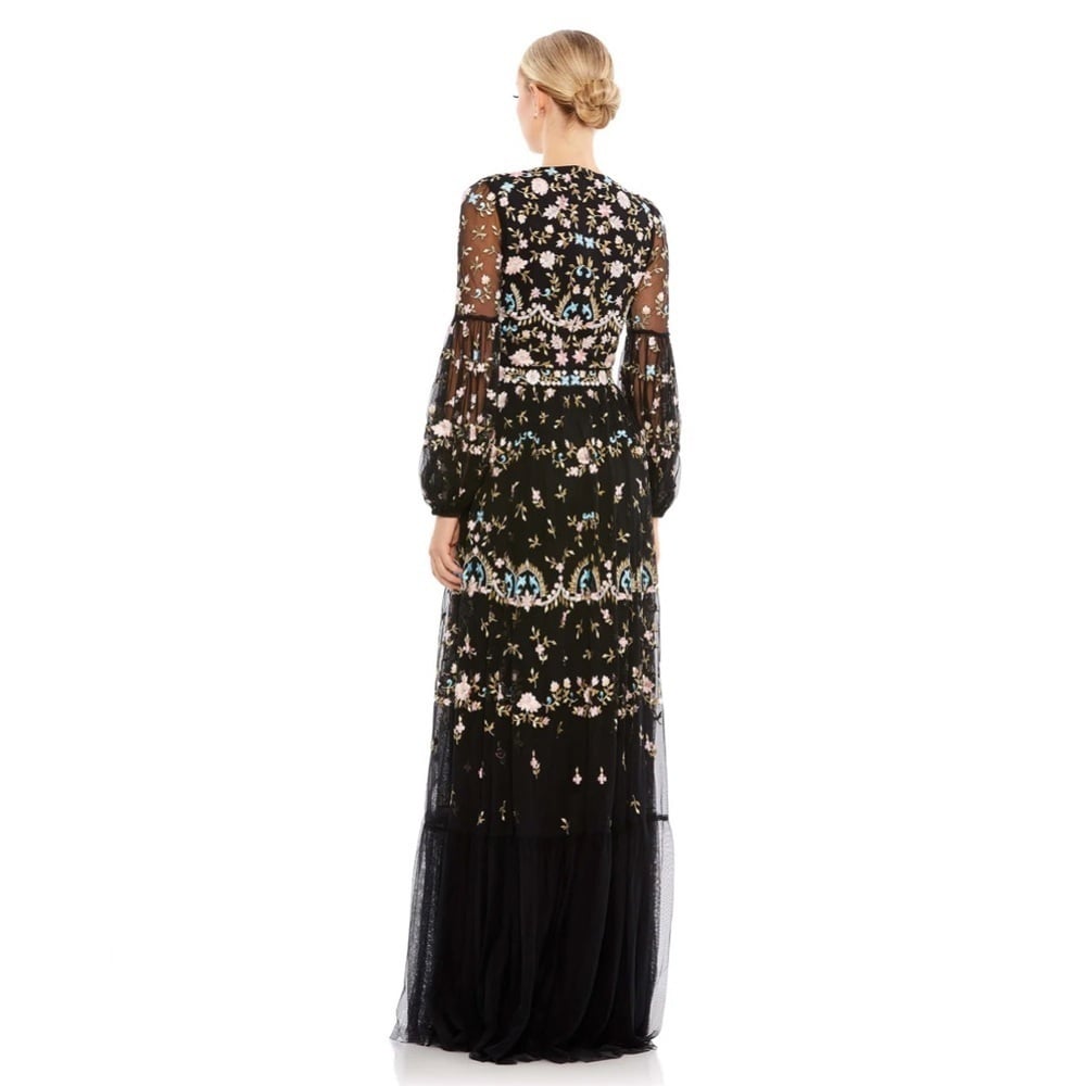 Adore the romance and ease of boho-chic frocks? You're in for a treat with this ethereal beauty made from soft netting embroidered with pastel botanicals. The dress is styled with a jewel neckline, sheer bishop sleeves, and a floaty skirt. Lightweight and fully lined through the body, the dreamy gown can be worn for outdoor garden parties as well as indoor ballroom events.