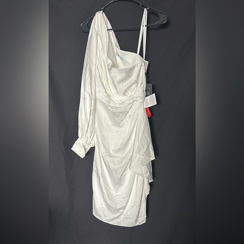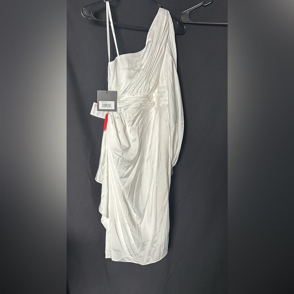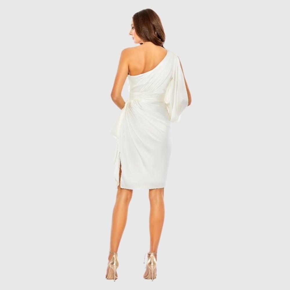 Satin one sleeved ruched cocktail dress with a cascading ruffle.