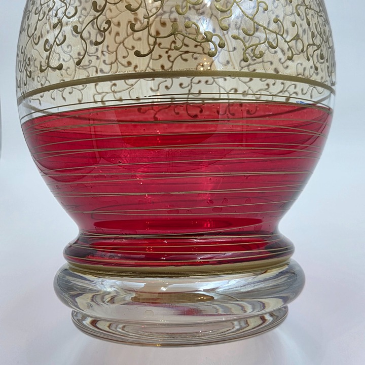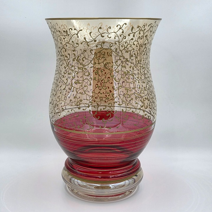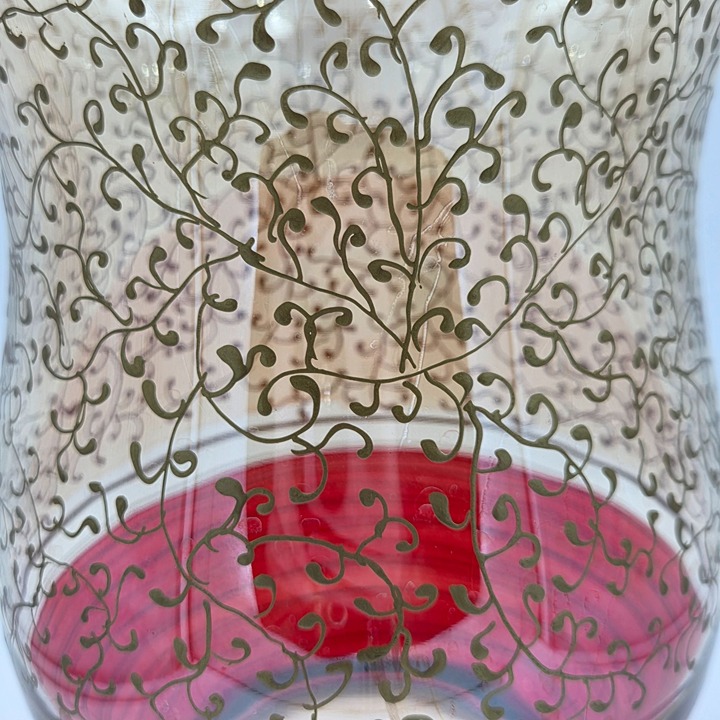 This Pier 1 Rioja blown glass hurricane candlestick features a striking red base with clear glass overlay and intricate gold scrollwork, accented with a gilded rim. Measuring approximately 10 3/4" tall by 6 3/4" wide, this discontinued Pier 1 Imports design is part of the Rioja collection, known for its bold colors and elegant detailing.