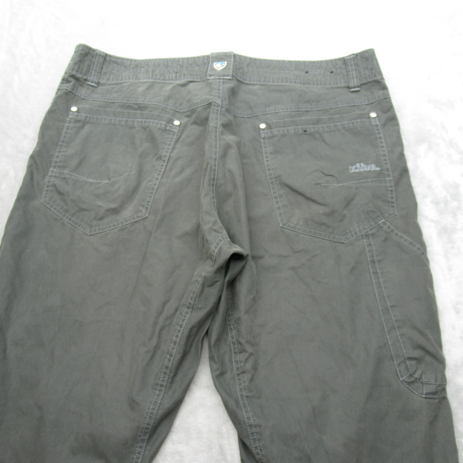 Versatile Kuhl men's trousers designed for the modern adventurer. These gray pants blend practicality with style, featuring a comfortable fit and durable construction. Noticeable marks offer character, but the pants maintain their functionality.