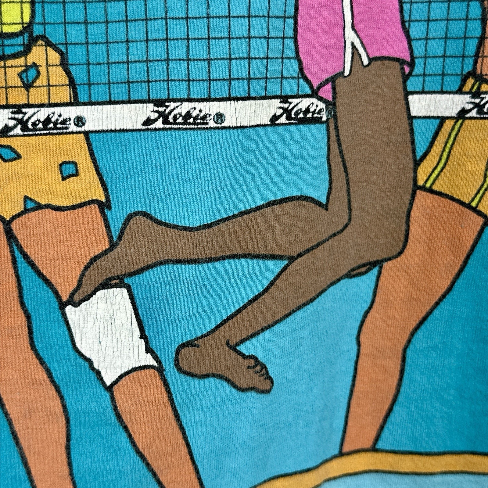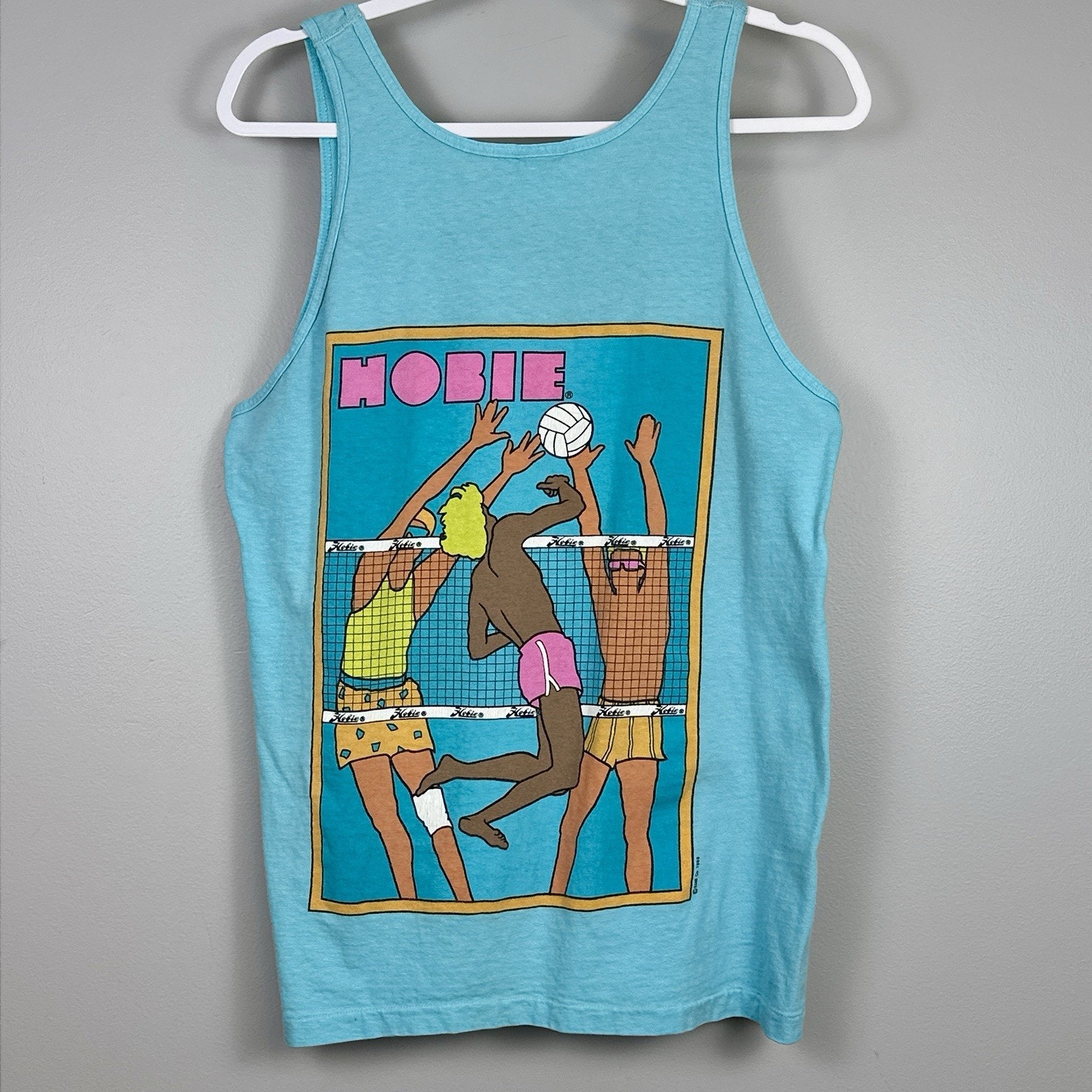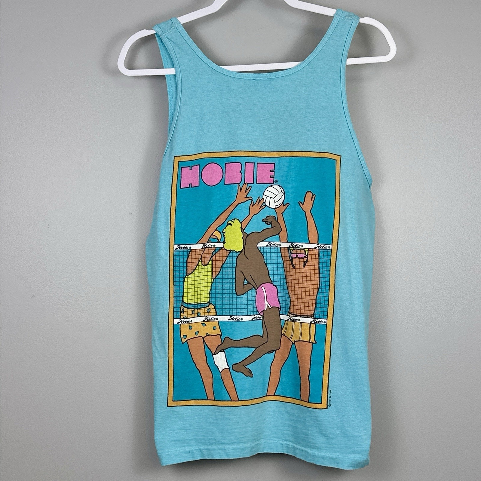 Listed is a vintage Hobie tank top, featuring a vibrant 80s Pop Art-style volleyball graphic. With its bright beach colors and cartoon-like design, this piece is perfect for lovers of vintage surf culture and bold graphic fashion. Marked SMB Co. 1988.