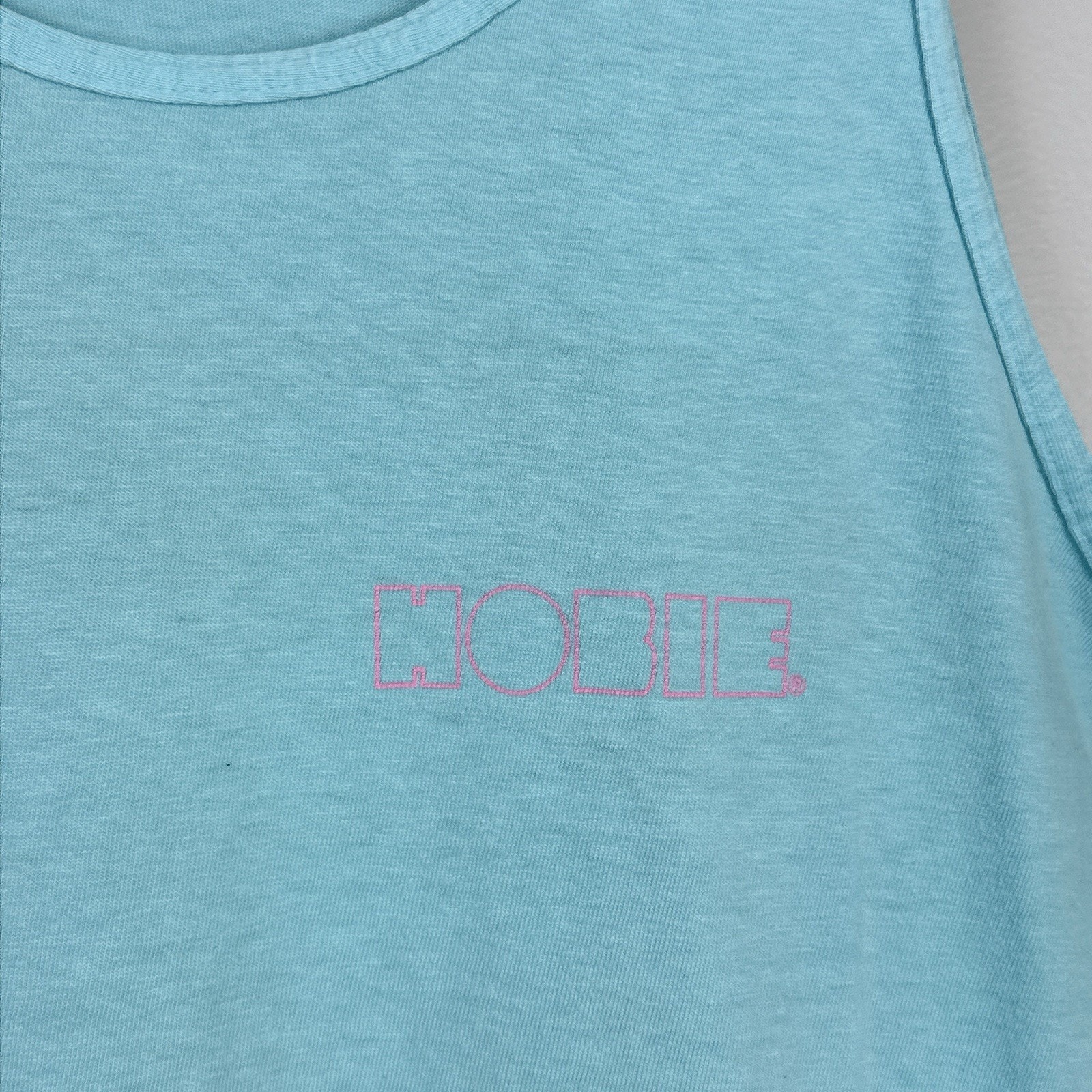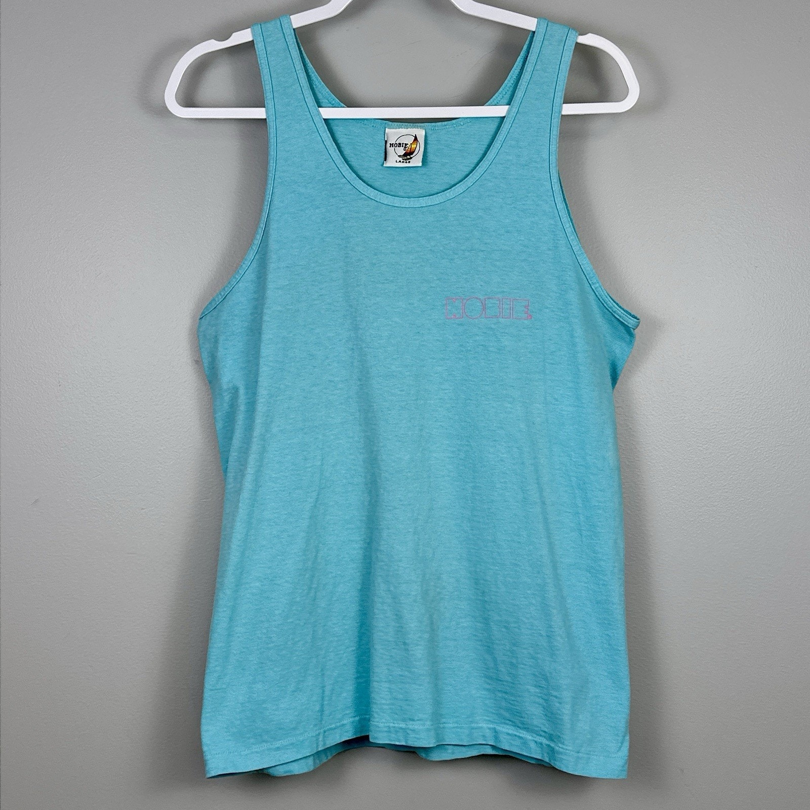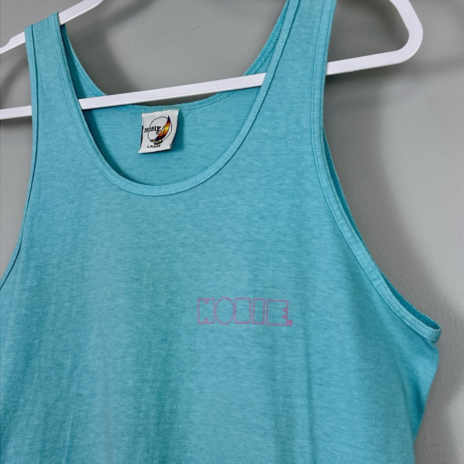 Listed is a vintage Hobie tank top, featuring a vibrant 80s Pop Art-style volleyball graphic. With its bright beach colors and cartoon-like design, this piece is perfect for lovers of vintage surf culture and bold graphic fashion. Marked SMB Co. 1988.