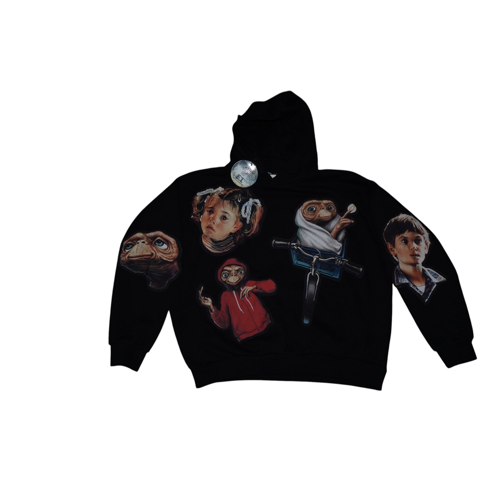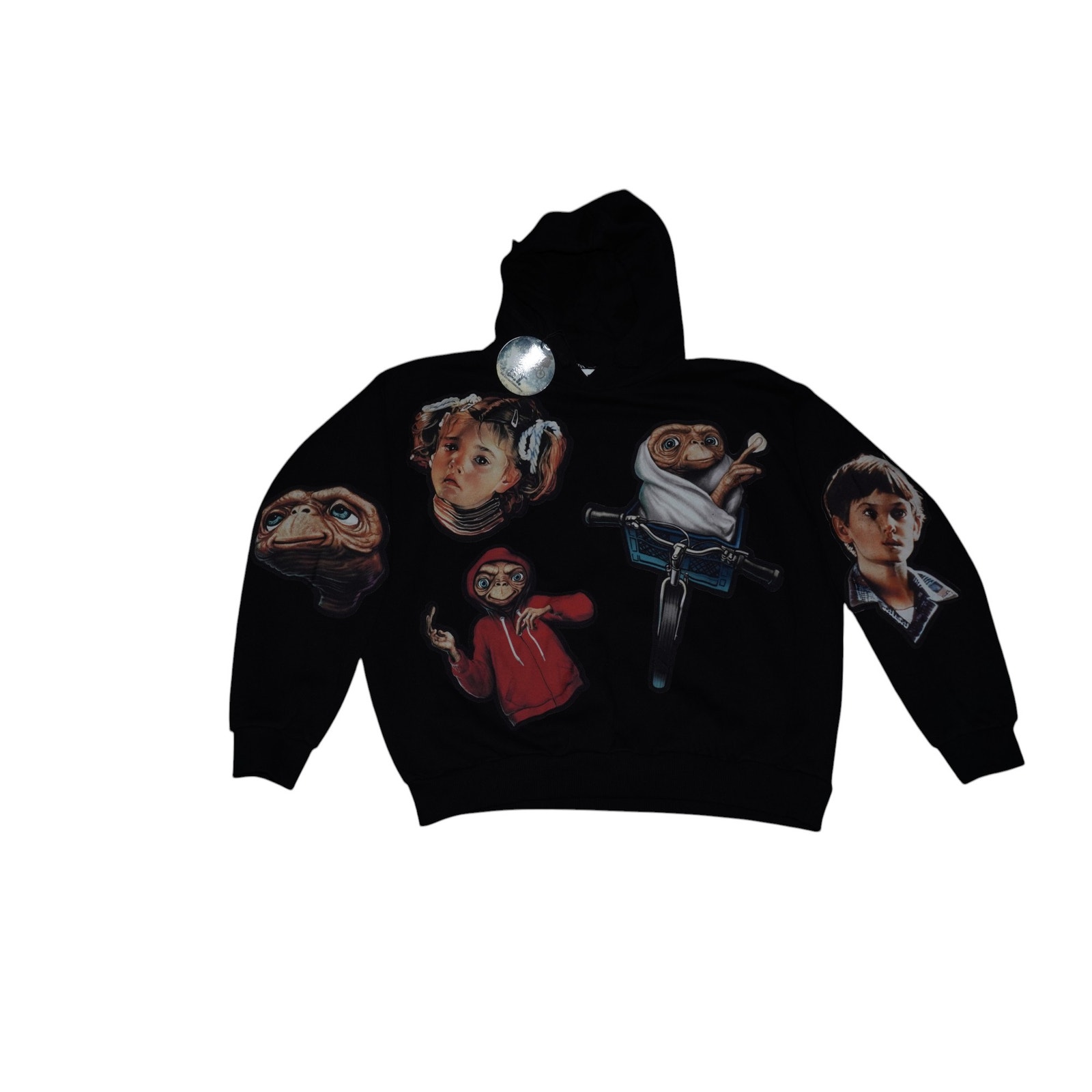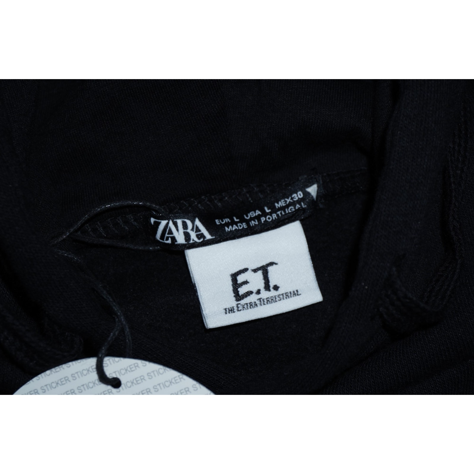 Rare Zara x E.T. The Extra-Terrestrial collaboration hoodie in black. Features bold front and sleeve graphics of E.T., Elliott, and Gertie, plus the iconic bicycle moon scene on the back. Made in Portugal.