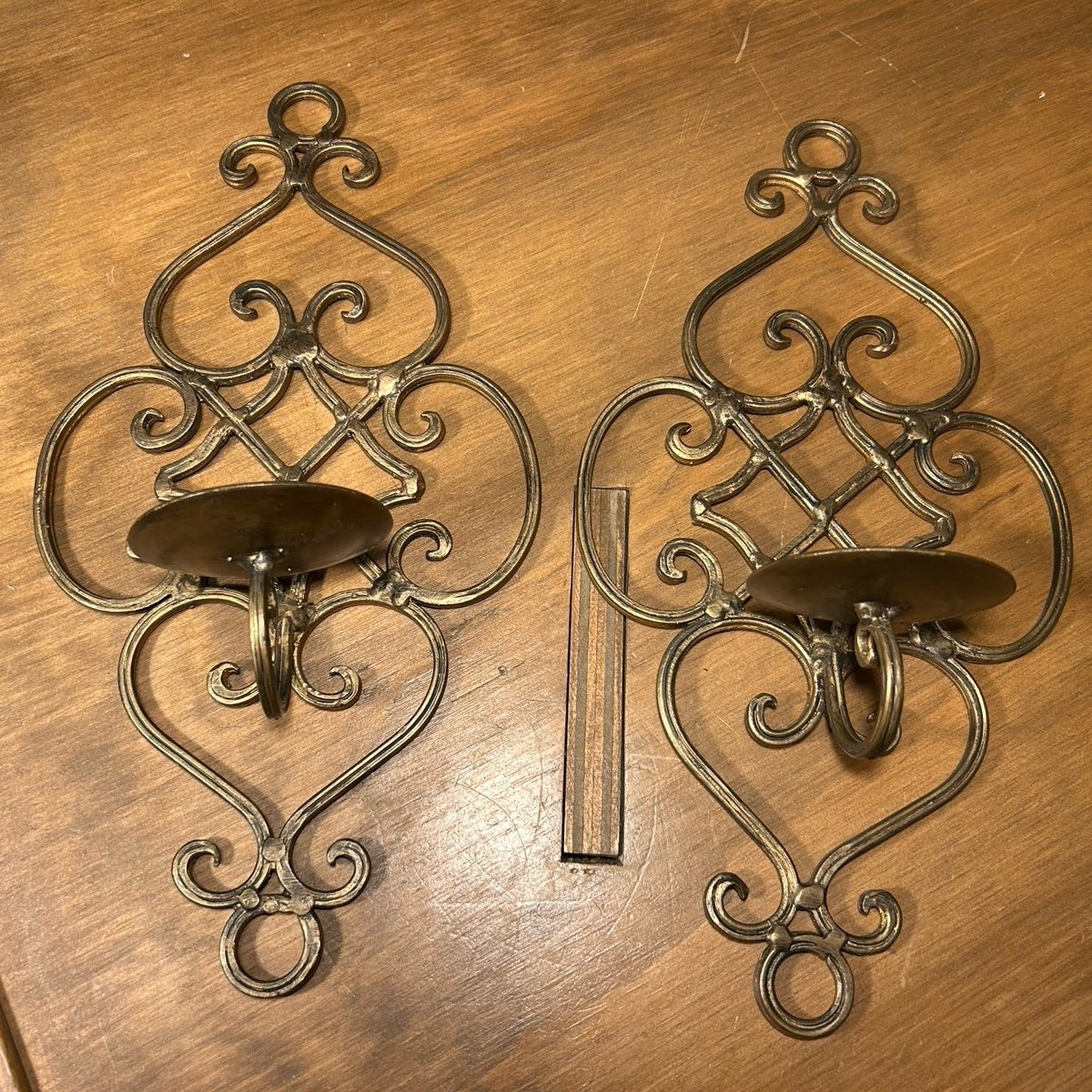 For sale are a pair of vintage, mid-century, wall-sconce, candle holders. These two wall-hangers are made of gold-toned metal in a scroll design. They measure approximately 13.25" tall and 6.75" wide and is in the shape of a diamond. Both wall scones are in good, vintage condition with one candle holder having a slight tilt. See photos for details on condition.
