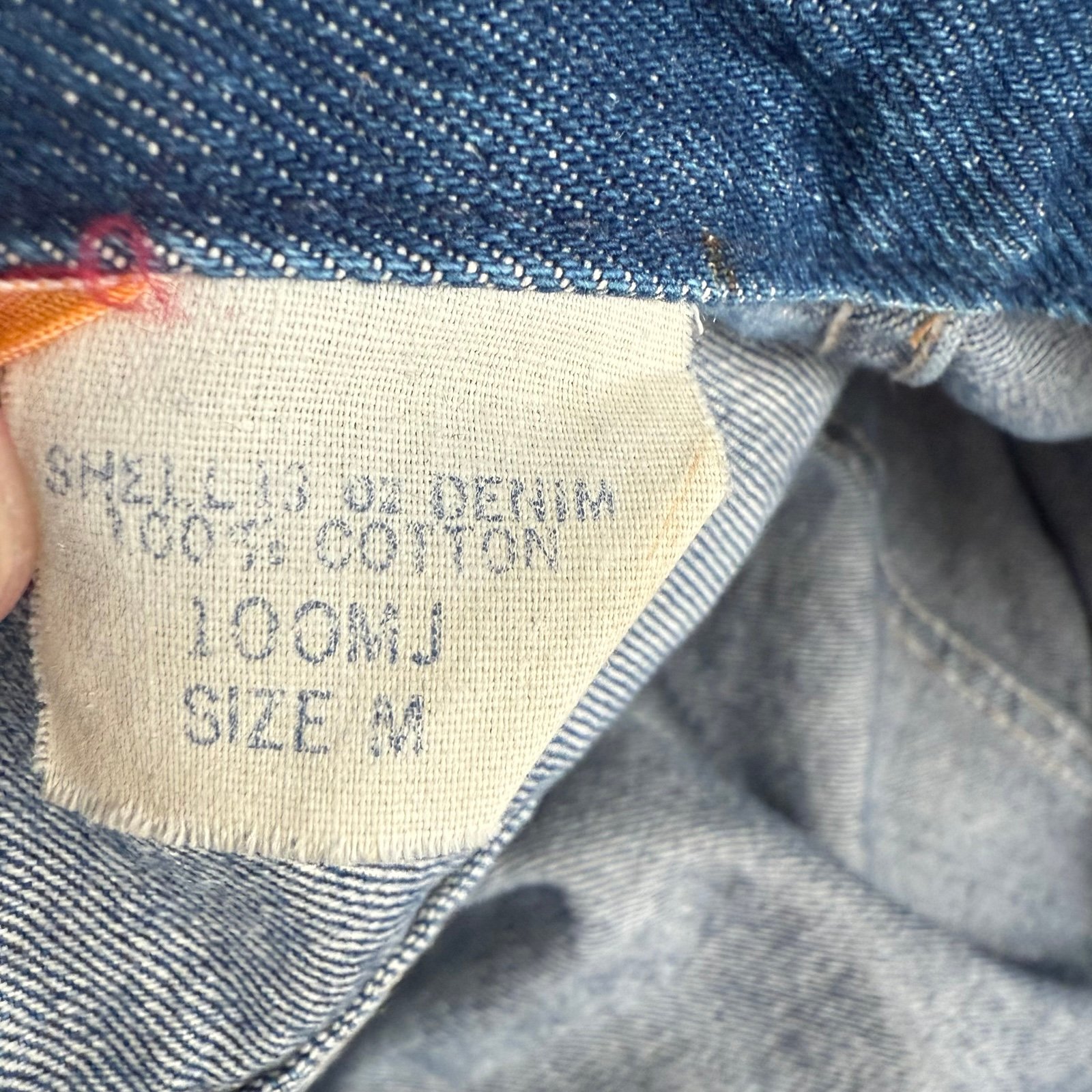 Vtg 70s Rustler Dark Blue Jean denim Jacket trucker men small medium streetwear made in the USA. Classic vintage jacket in dark sturdy denim with zigzag stitching. This jacket has some character with a splotchy finish and some green on the buttons. This jacket was worn and loved for sure. Size tag says medium, may better fit modern men’s small. Could easily be unisex. Great for retro cowboy western trucker streetwear style.