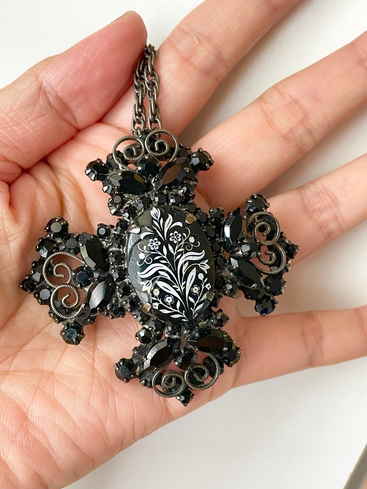 This is a very rare Juliana Maltese Cross brooch featuring striking black rhinestones. The central stone is adorned with a delicate floral motif, adding a touch of softness and elegance. Its design is richly detailed and dimensional, making it truly eye-catching.